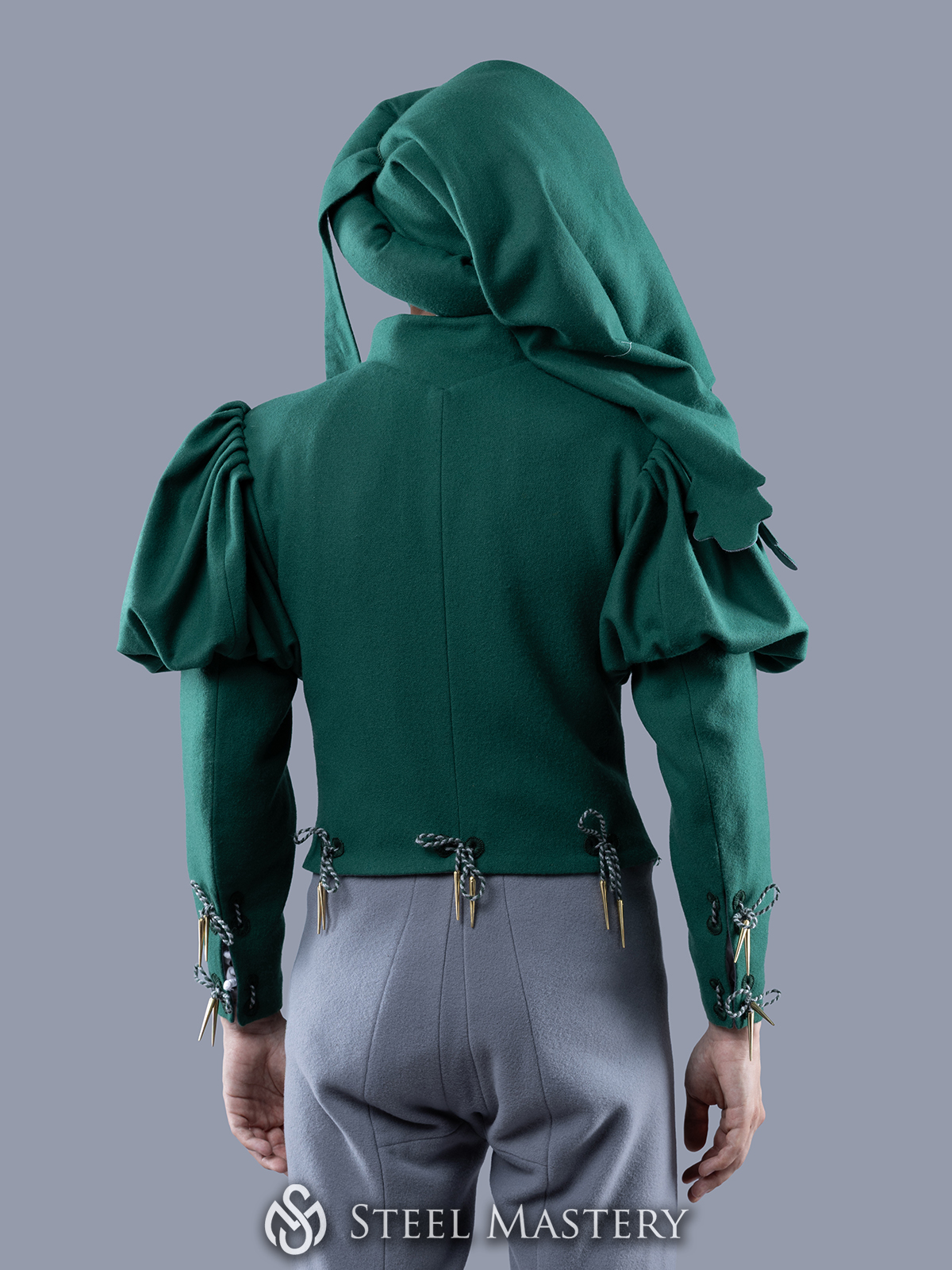 Let's start with the Burgundian doublet, XVth century. This is an indispensable element of the costume of any self-respecting Burgundian man in the XVth century. Tight fit over the body, lush bouffant sleeves, sexy chest slit and stylish lacing on the chest and wrists. A small stand-up collar and laces for tying up the chausses to the doublets' hem. Everything about it is laconic and stylish.