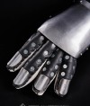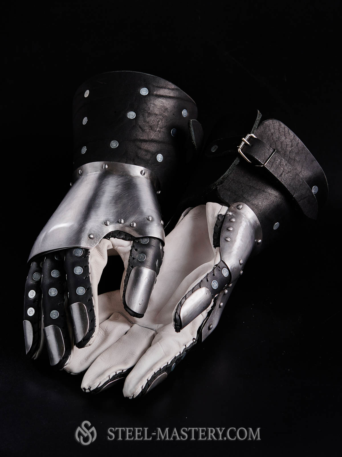 Metal plates are installed from the inner side of leather wristband, which is completely covers the wrist. Fingers are protected by overlapped steel plates. Leather straps on the palm part and belts with buckles on the wrists safely keep this medieval knight armour on the hand.