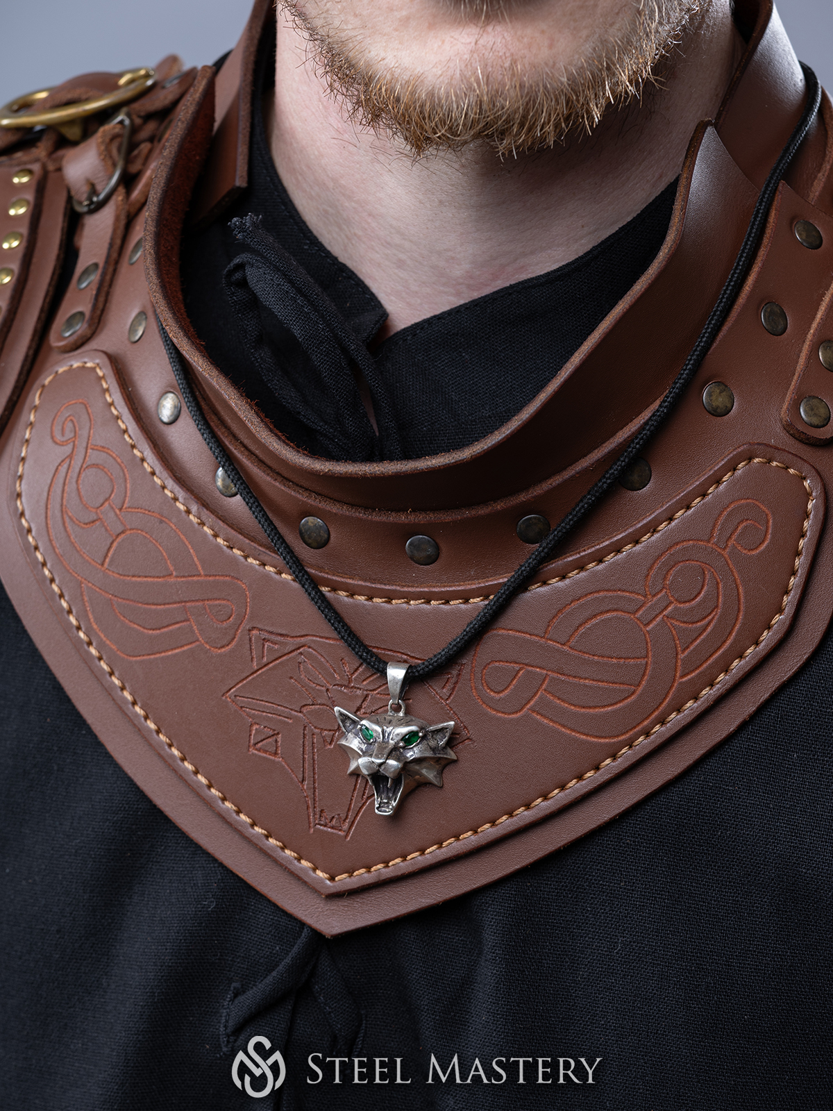 • Halskrause (Gorget) – Schützt Hals und oberen Brustbereich, verziert mit detaillierten handgravierten Designs, inspiriert von Hexer-Lore, und ausgestattet mit soliden Messingschnallen.