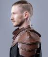 • Schulterplatten (Pauldrons) – Geschichtete Lederplatten mit handgravierten Motiven, Messingschnallen und goldfarbenen Nieten für ein robustes, kampfbereites Aussehen.