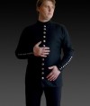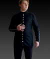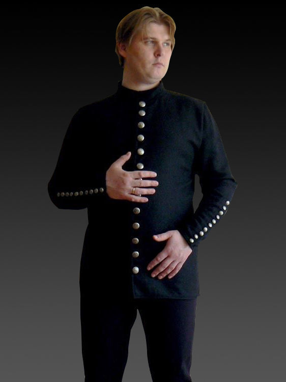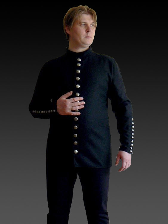 Medieval doublet of XV century with stand-up collar has 13 metal buttons for fastening in front and 10 buttons on the each sleeve.