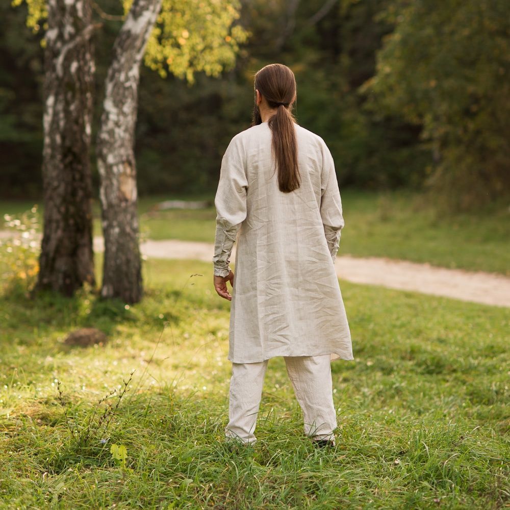 The shirt is being made of 100% natural fabrics: linen, cotton, wool, velvet or silk. Different colours are available for order.