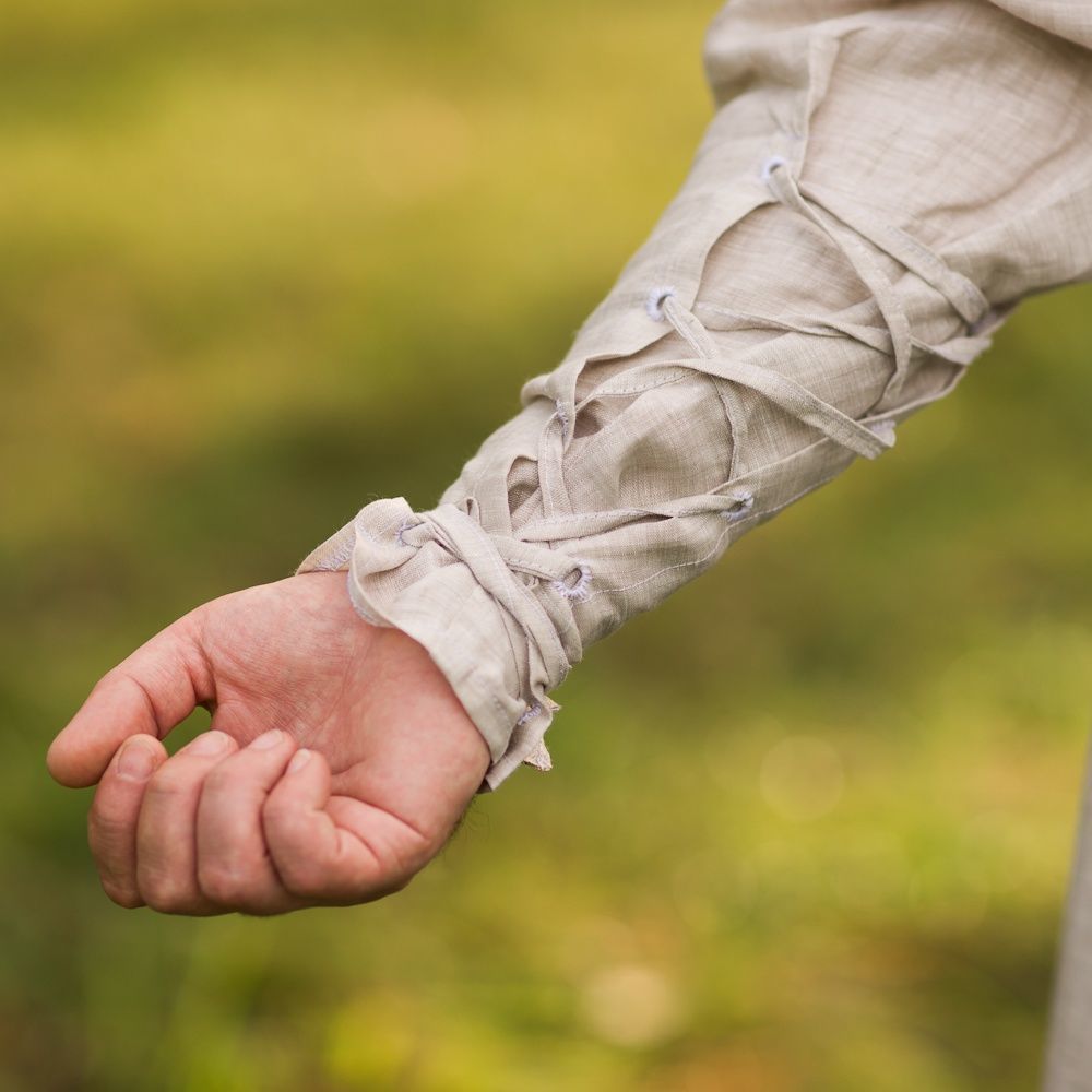 There is lacing on neck and sleeves, which allows you to fit this medieval underwear tightly. All holes for lacing are trimmed by hand.