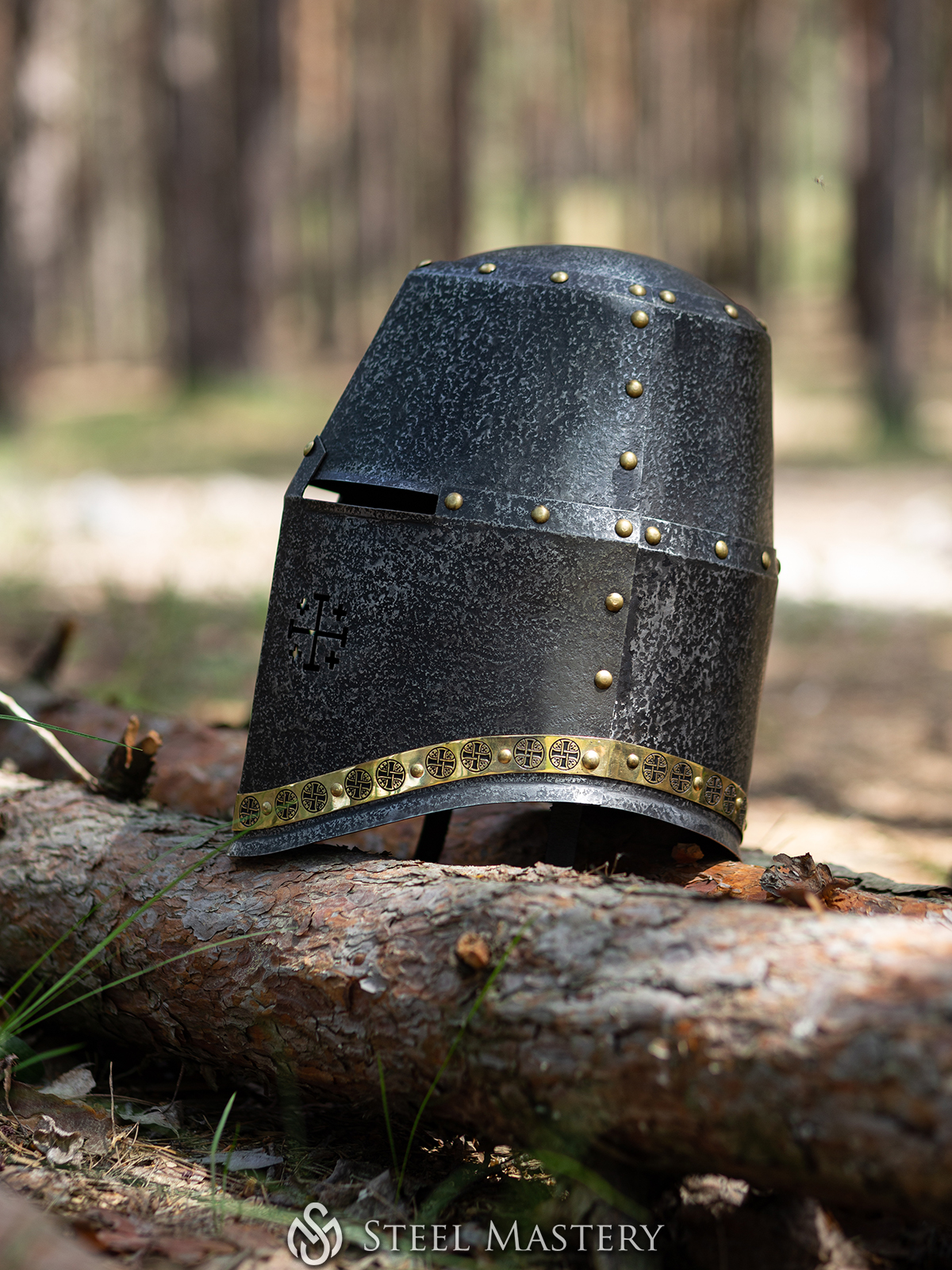 Great helm appeared approximately in the end of the XII century in times of Crusades and was in use among cavalrymen until the XIV century.