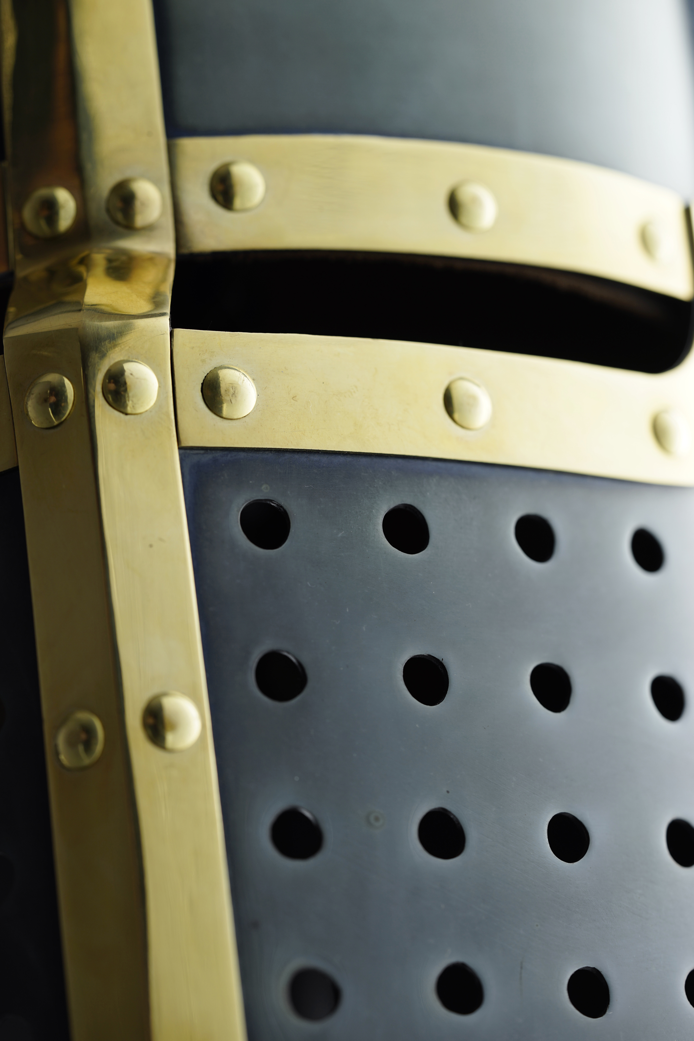 The shape of the helmet changed from conical to cylindrical. The former half-mask was solved drastically - in the cylinder there were simply holes for the eyes and a lot of small holes below for ventilation. And on the top of it they just riveted a metal circle. That is how we got the pothelm, affectionately known amongst re-enactors as the bucket.