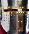 Frontage of pot helm is equipped with forced cross-shaped plate. We recommend wearing of this medieval battle helm over mail coif and padded liner for complete protection.