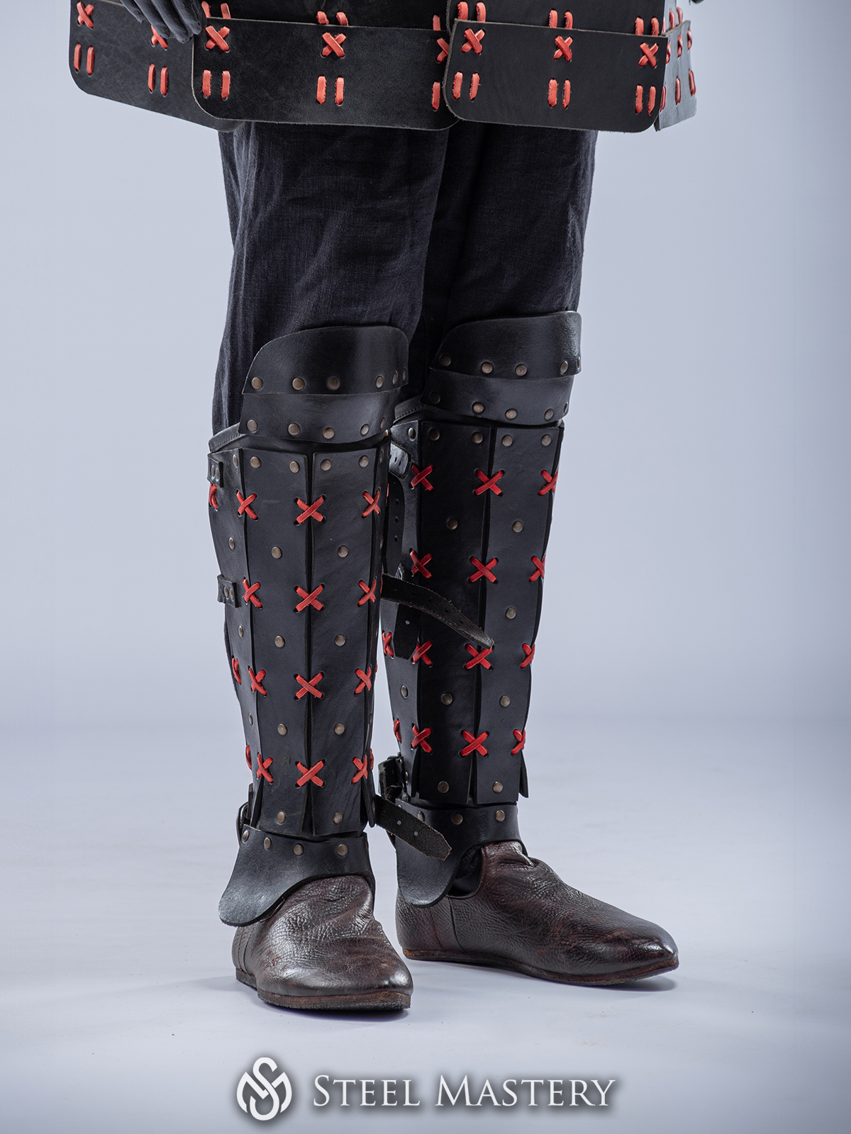 Greaves with protection of the knee and arch of the foot, made of tied together black leather plates (hard belt leather 3-4 mm thick) with "crazy horse" skin (1.4-1.6 mm thick) as a base
