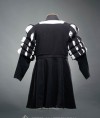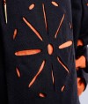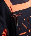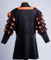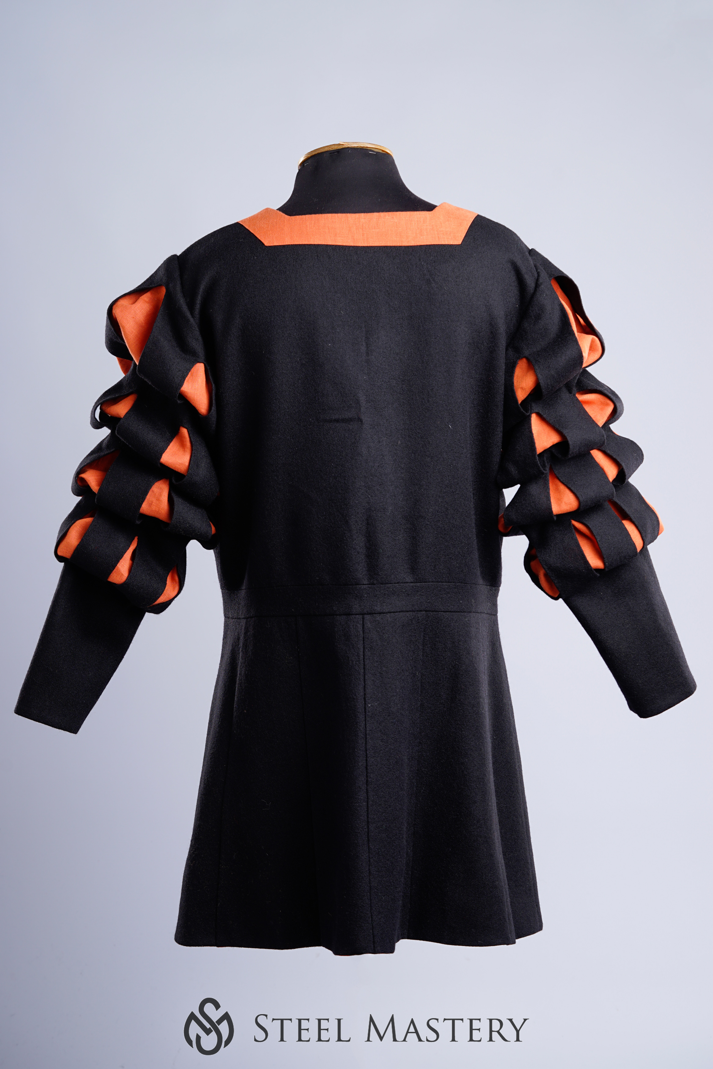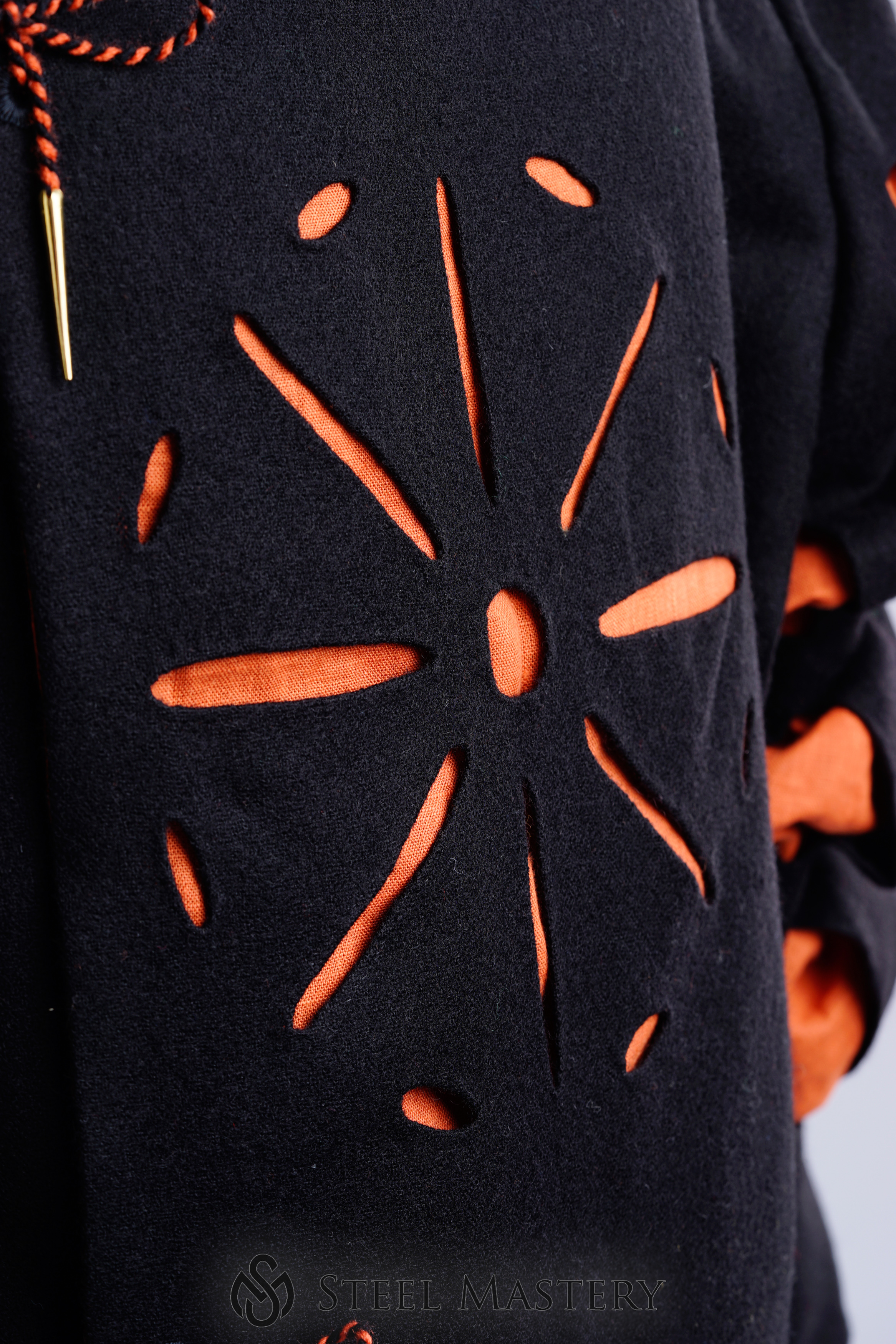 This particular coat features a striking combination of black wool and orange linen, with cuts on the chest, sleeves, and bottom edge. The black and orange color scheme of the coat is both eye-catching and symbolic. Black was a popular color for Landsknecht clothing, representing strength and authority. Orange, on the other hand, was often used as an accent color to represent wealth and status.