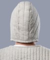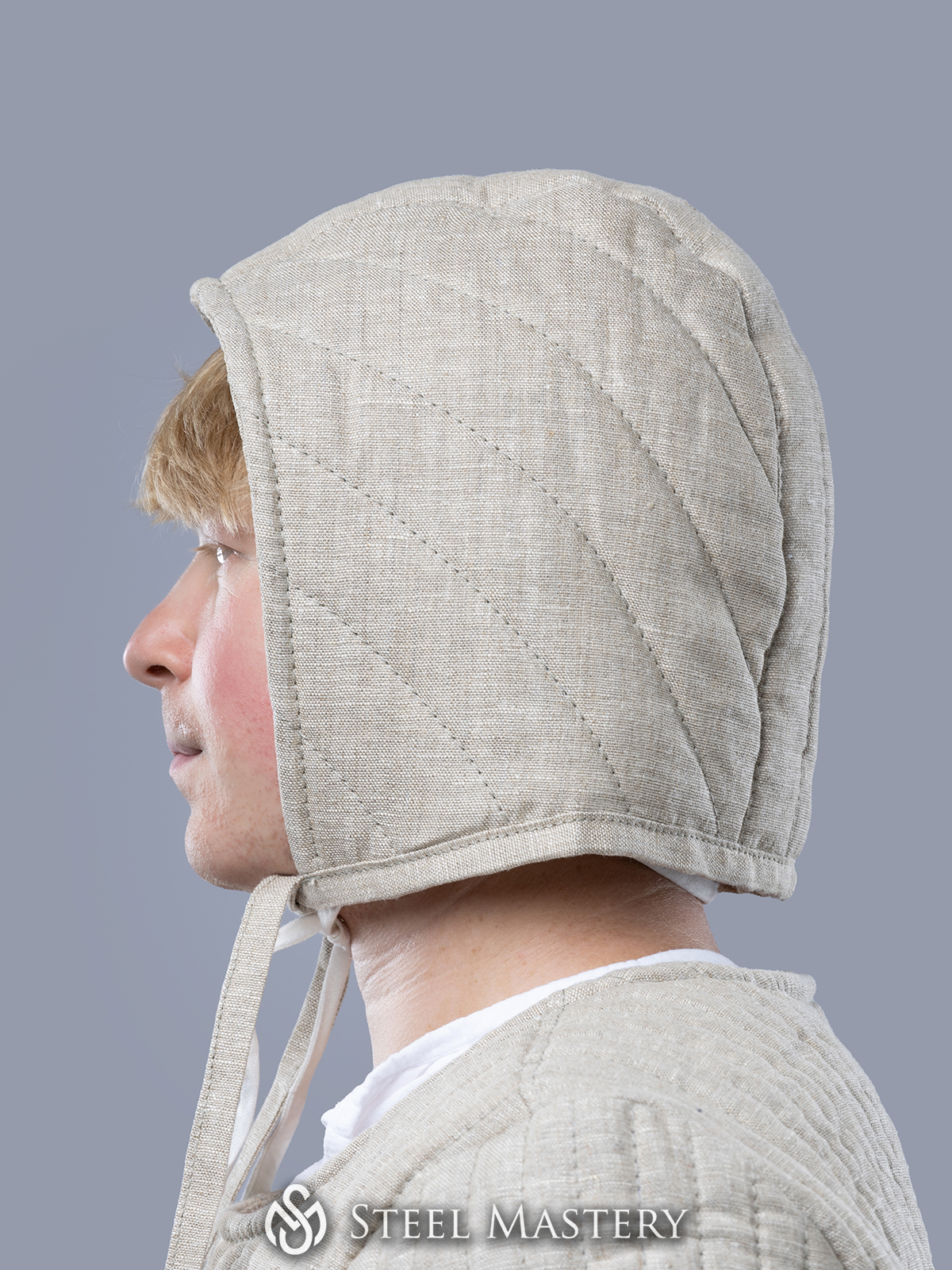 Eine eng anliegende mittelalterliche Kappe mit klarer, strukturierter Silhouette und charakteristischen geschwungenen Steppnähten.