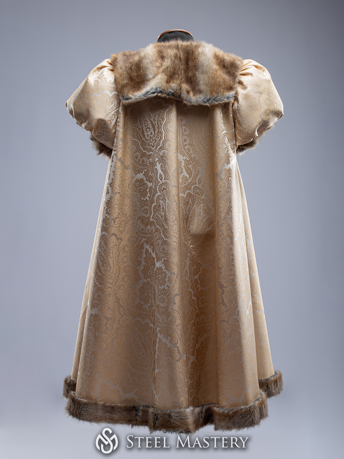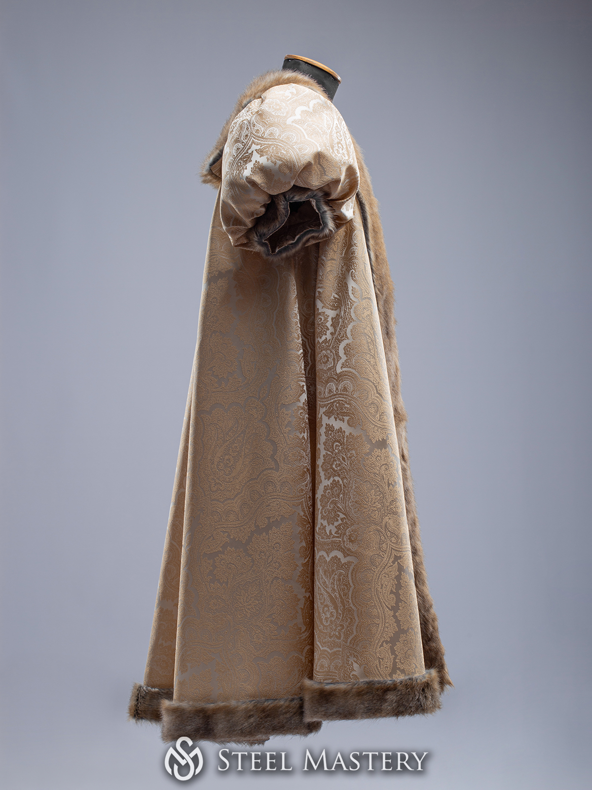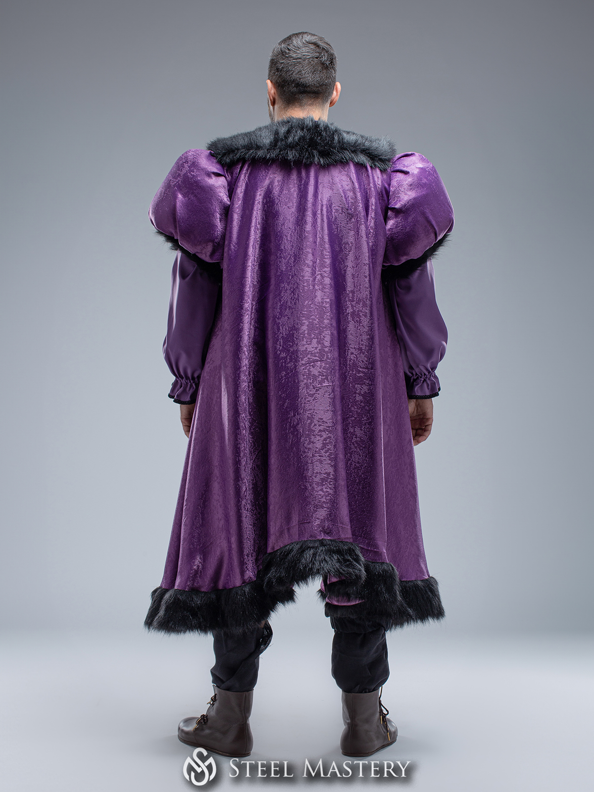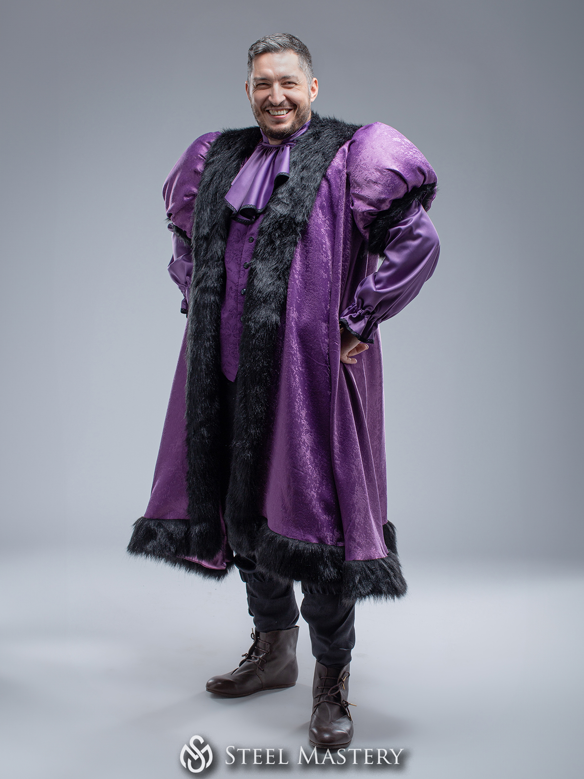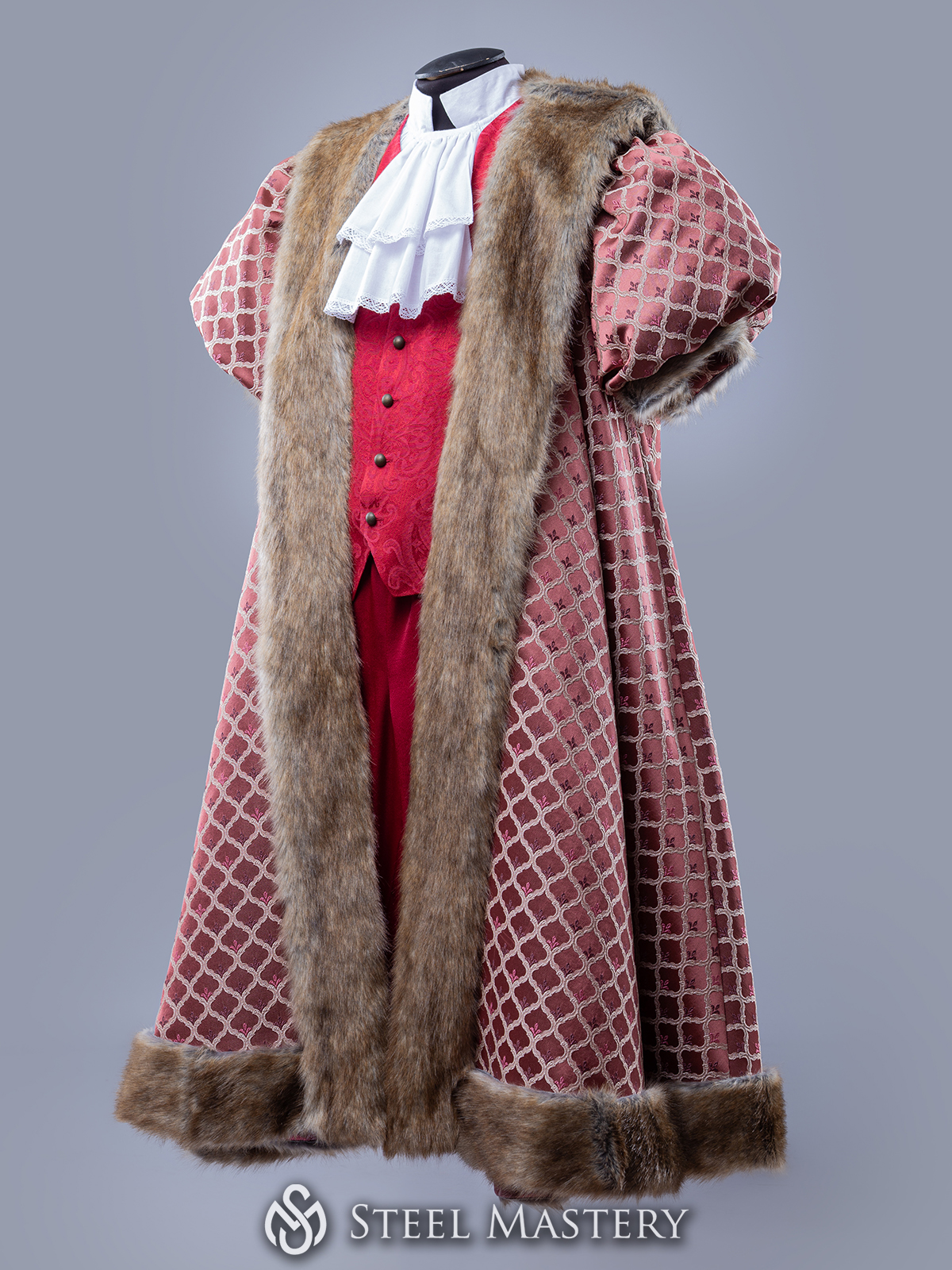 Dies ist eine Stilisierung des Schaube aus dem 16. Jahrhundert. Wie es in der Renaissance üblich war, kann dieses Gewand aus Samt oder Jacquard gefertigt und mit Leinen oder Baumwolle gefüttert werden. Wenn Sie jedoch wirklich das Bild eines großartigen Königs verkörpern möchten, sind wir bereit, für Sie einen Pelzmantel mit einem Futter aus Brokat, Seide oder Samt anzufertigen.