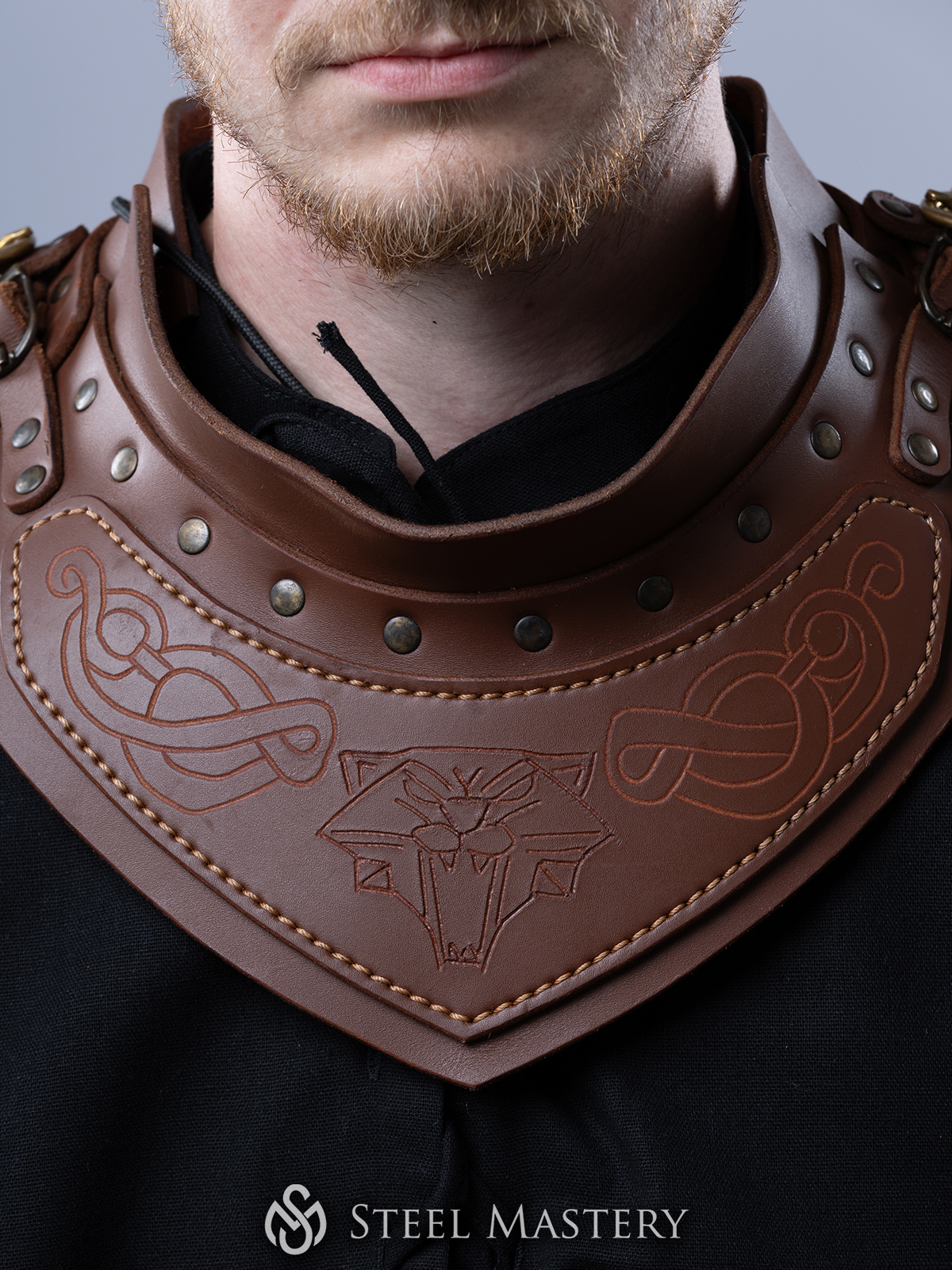 Schützt den Hals und den oberen Brustbereich, verziert mit detaillierten, handgeschnitzten Motiven, die von der Witcher-Saga inspiriert sind, und mit massiven Messingschnallen versehen.