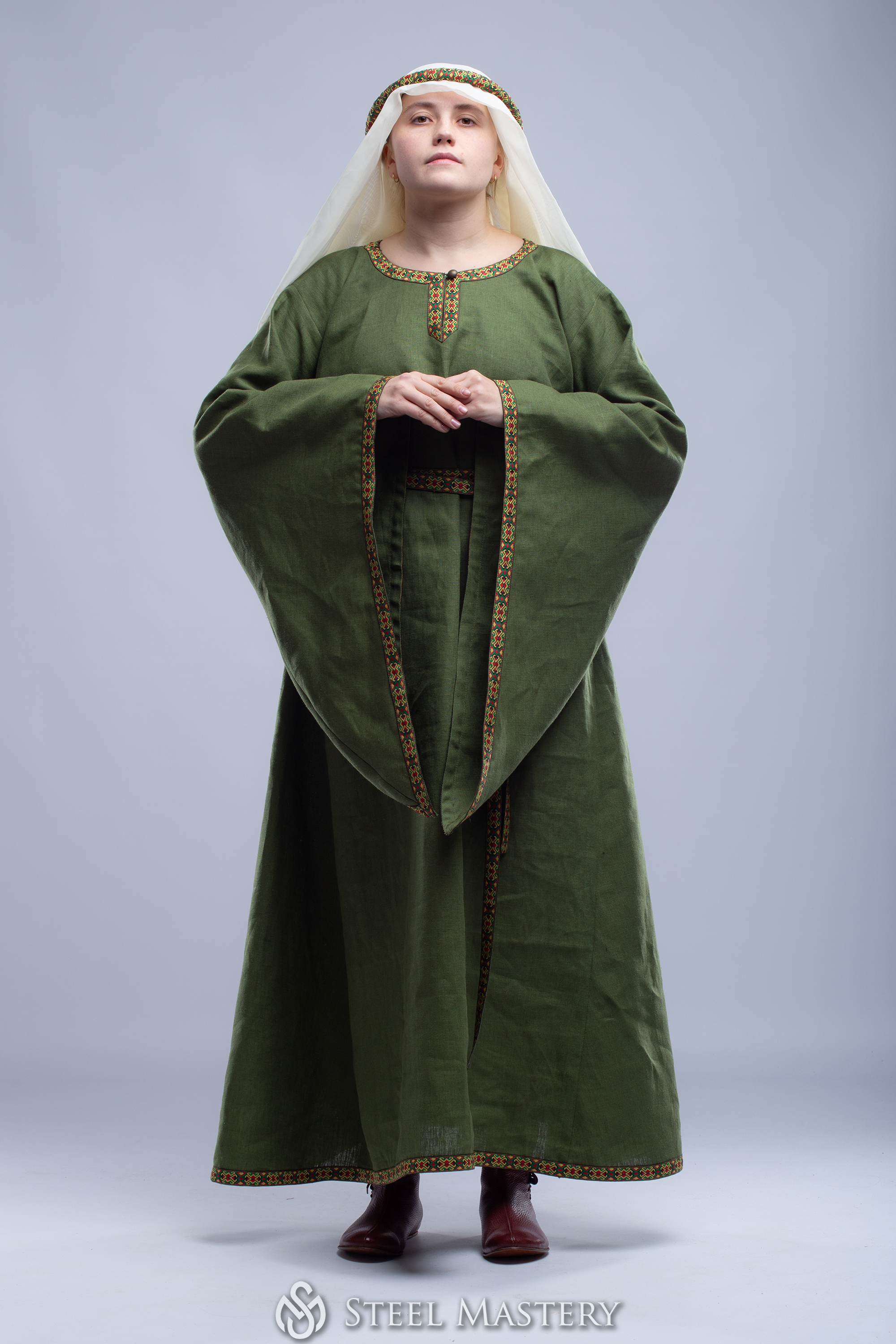 Try to feel yourself like a sophisticated medieval Lady, delicate strolling through the hall of the castle or festival field at this medieval princess dress. Gentle picking up a long dress hem and hiding thin hands in the wide sleeves of your bliaut. Realize this dress is not just beautiful medieval woman costume, it allows any of modern woman to feel like a fragile lady of the 12th century, a damsel in distress or a beautiful lady in the window.