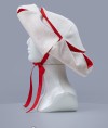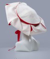 Headwear is made of wool with linen lining of contrast colour. It is tied up under the chin with fabric strap.