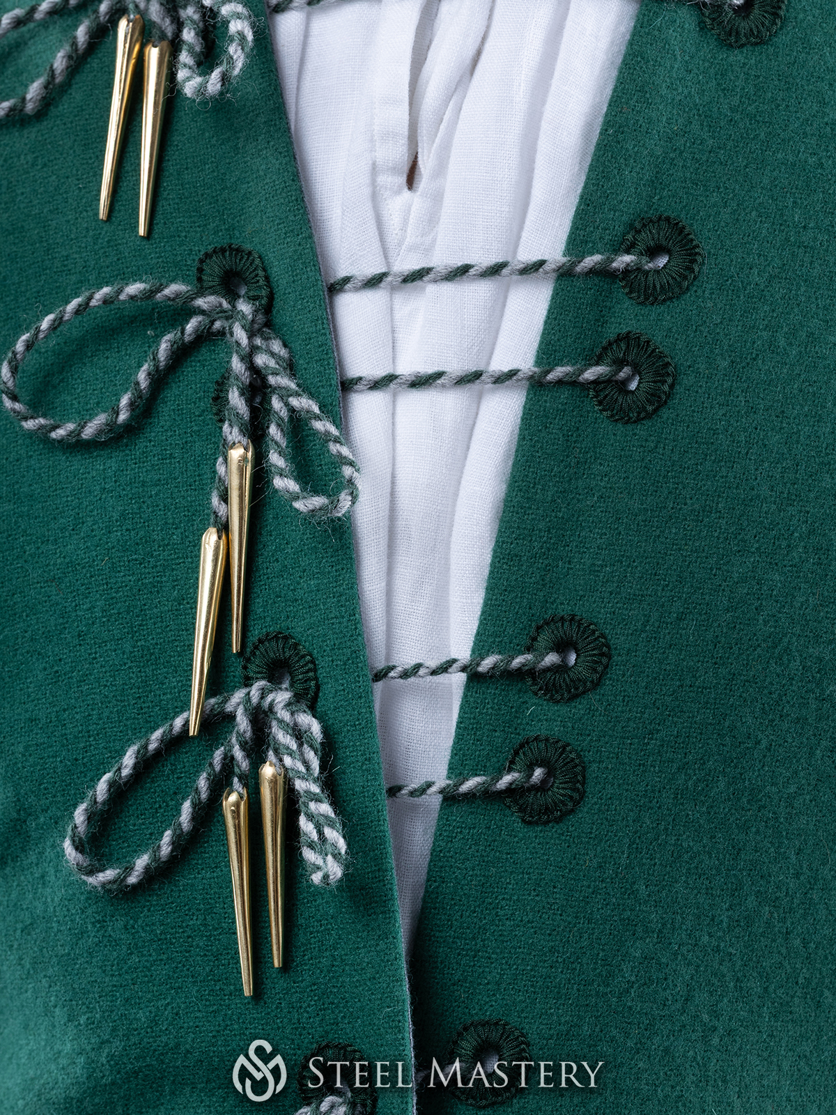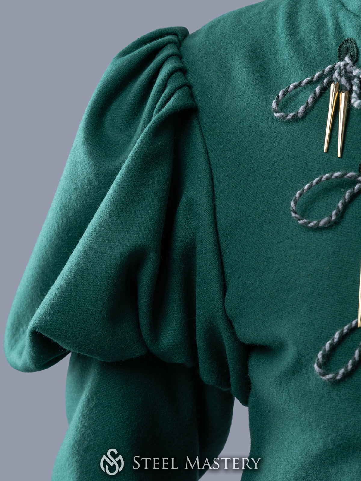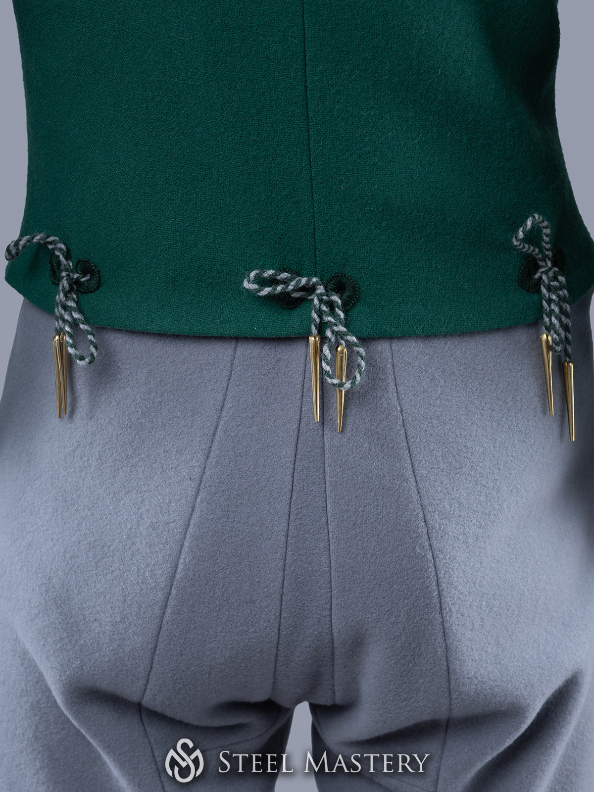 Let's start with the Burgundian doublet, XVth century. This is an indispensable element of the costume of any self-respecting Burgundian man in the XVth century. Tight fit over the body, lush bouffant sleeves, sexy chest slit and stylish lacing on the chest and wrists. A small stand-up collar and laces for tying up the chausses to the doublets' hem. Everything about it is laconic and stylish.