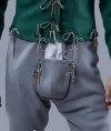 On the feet of our dandy you may see tight chausses with codpiece, XV century, which recently became fashionable in Europe. They are sewn on the back and the codpiece, folded down, is attached to the waist with 3 laces. It's a very comfortable and at the same time quite historical model of chausses, which you will undoubtedly appreciate.