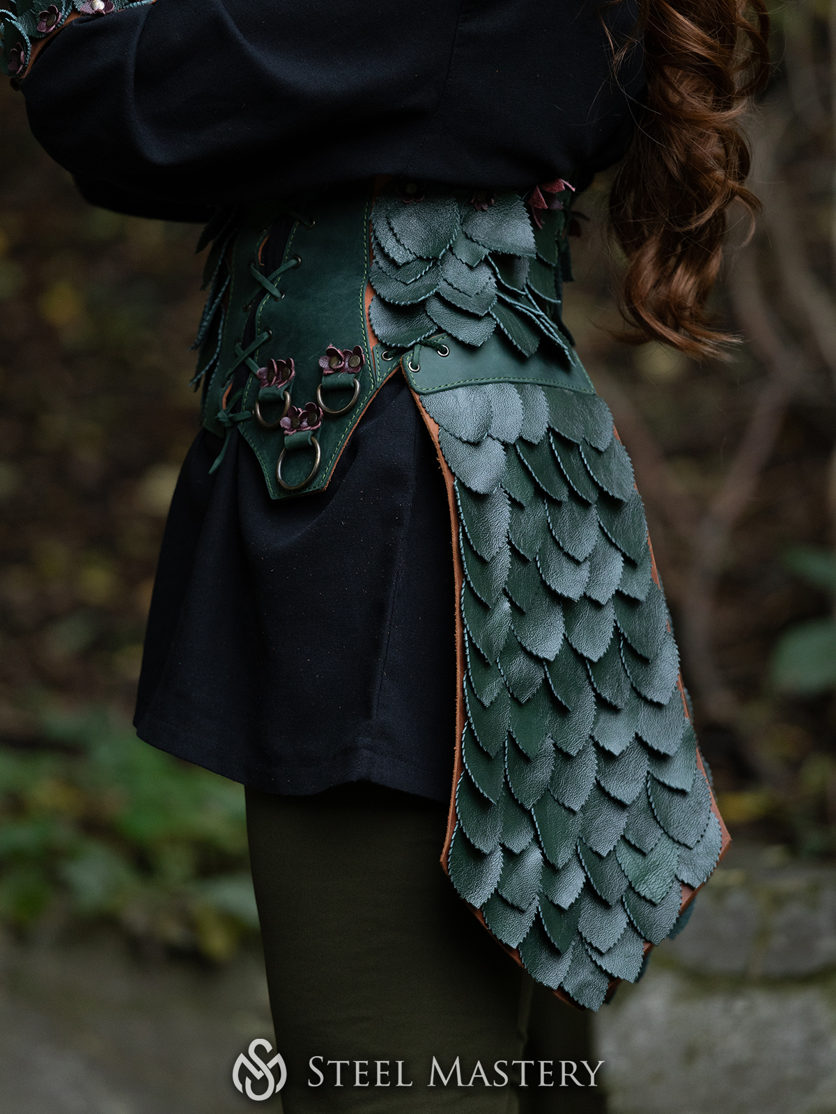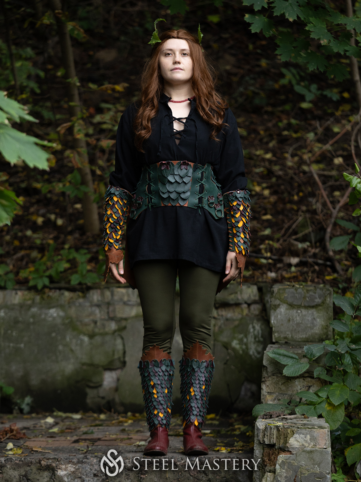 Confeccionado en cuero genuino de alta calidad, cada pieza está teñida en tonos terrosos y moldeada para evocar las texturas de la naturaleza. Perfecto para LARP, cosplay, sesiones fotográficas de fantasía o actuaciones escénicas.