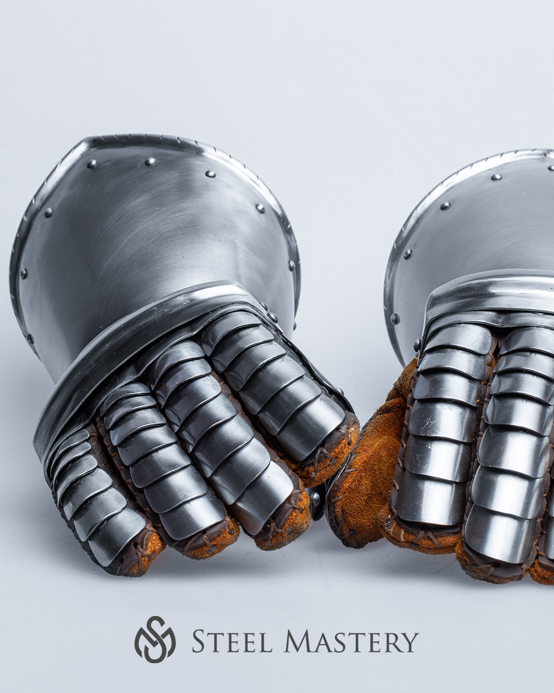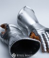 Made of steel, these gauntlets featured a series of overlapping plates that were secured together with leather straps and buckles. The fingers were protected by individual plates that were hinged together, allowing for greater flexibility and movement. The gauntlets also featured a flared cuff that extended up the forearm, providing additional protection to this vulnerable area.
