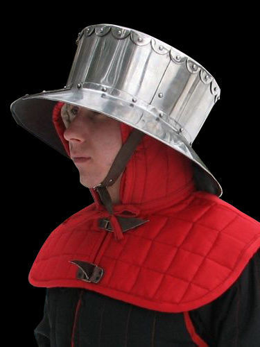 This medieval steel helm got its name because of shape wide-brimmed hat. For better protection, kettle hat could be equipped with gorget and was being worn over the padded or mail coif. Also, one of main advantages of such type of head armor was protecting against sun rays.