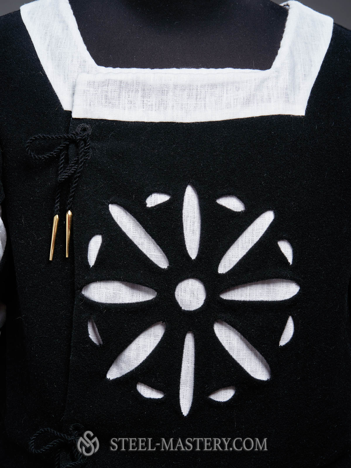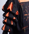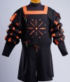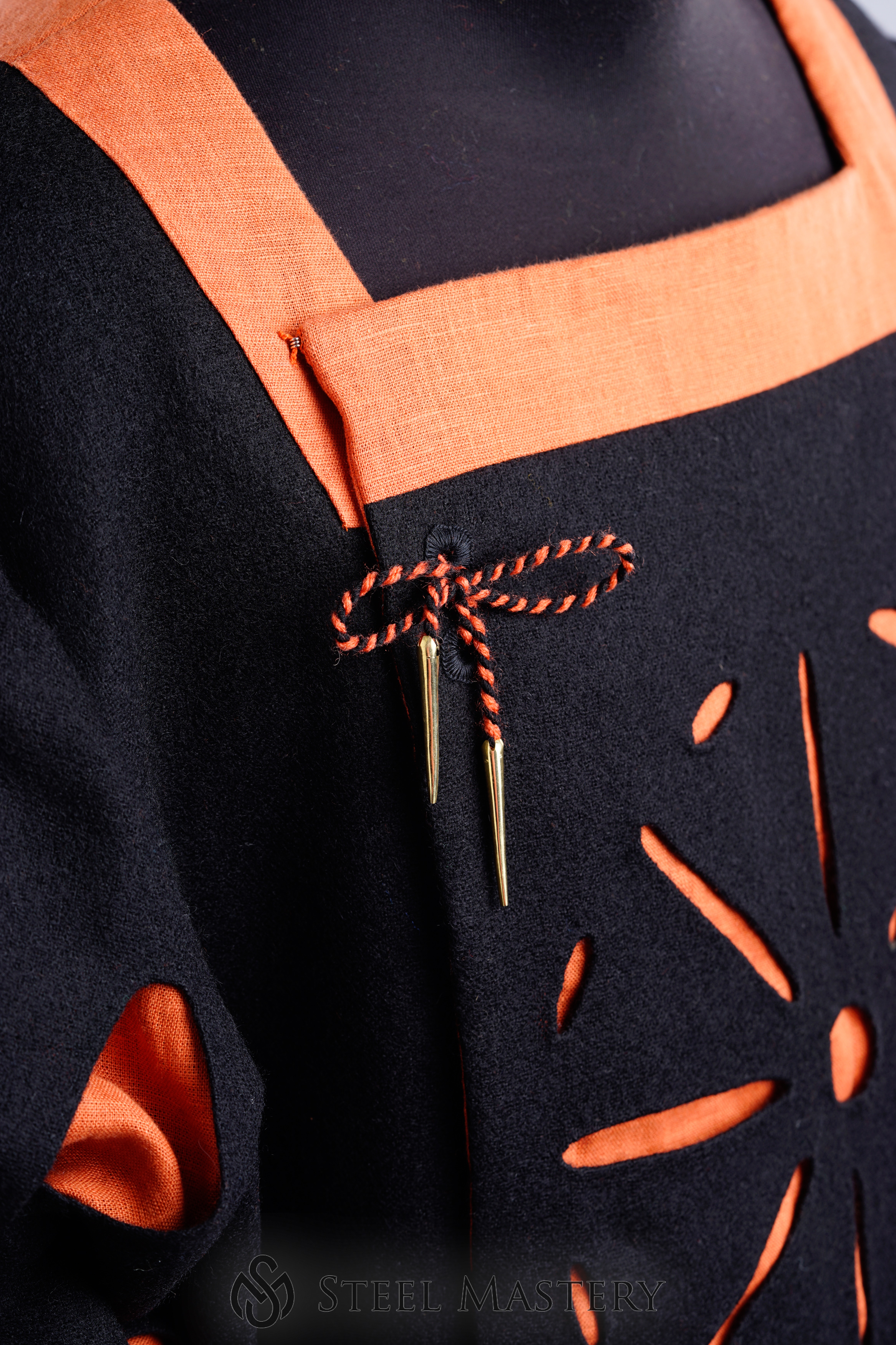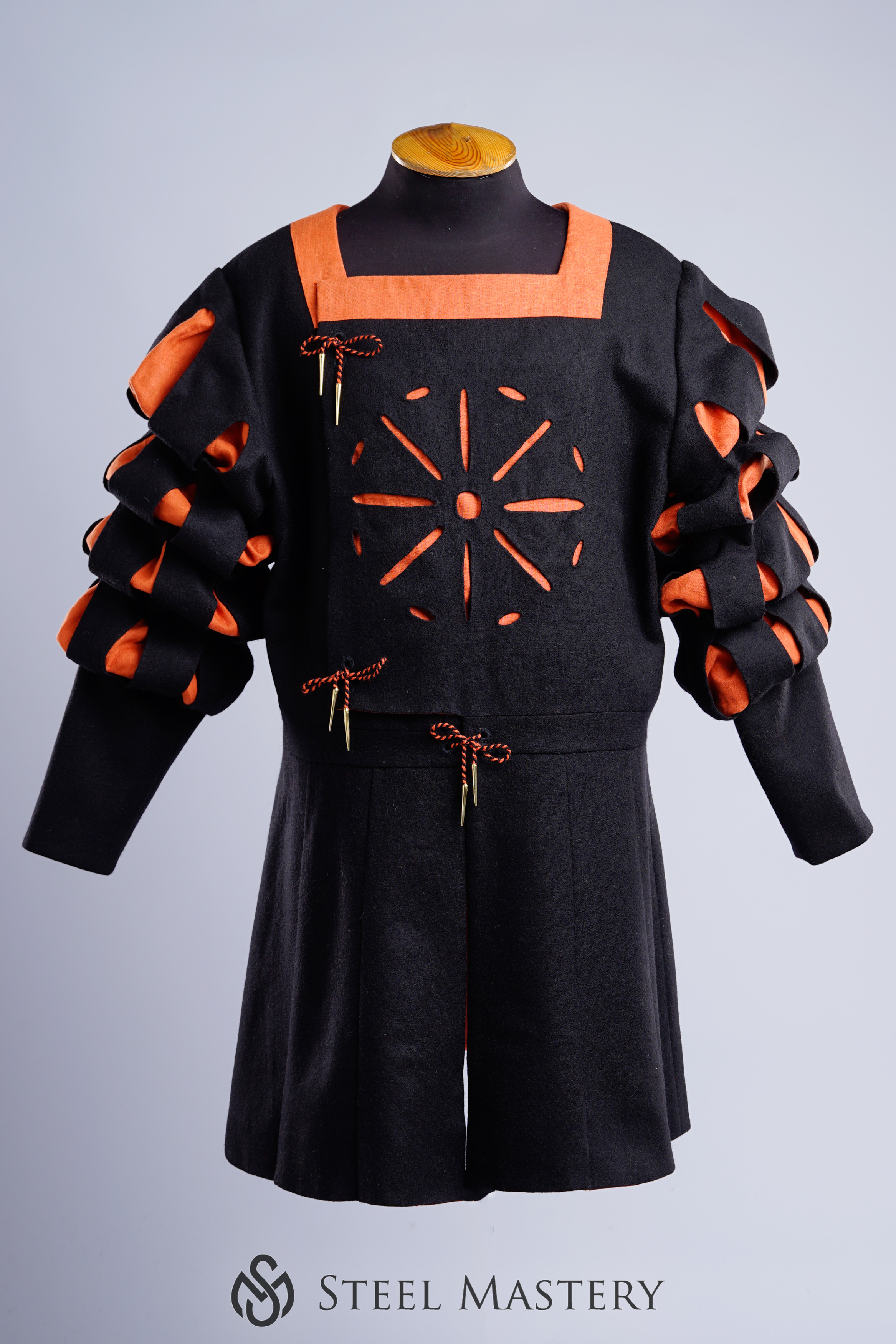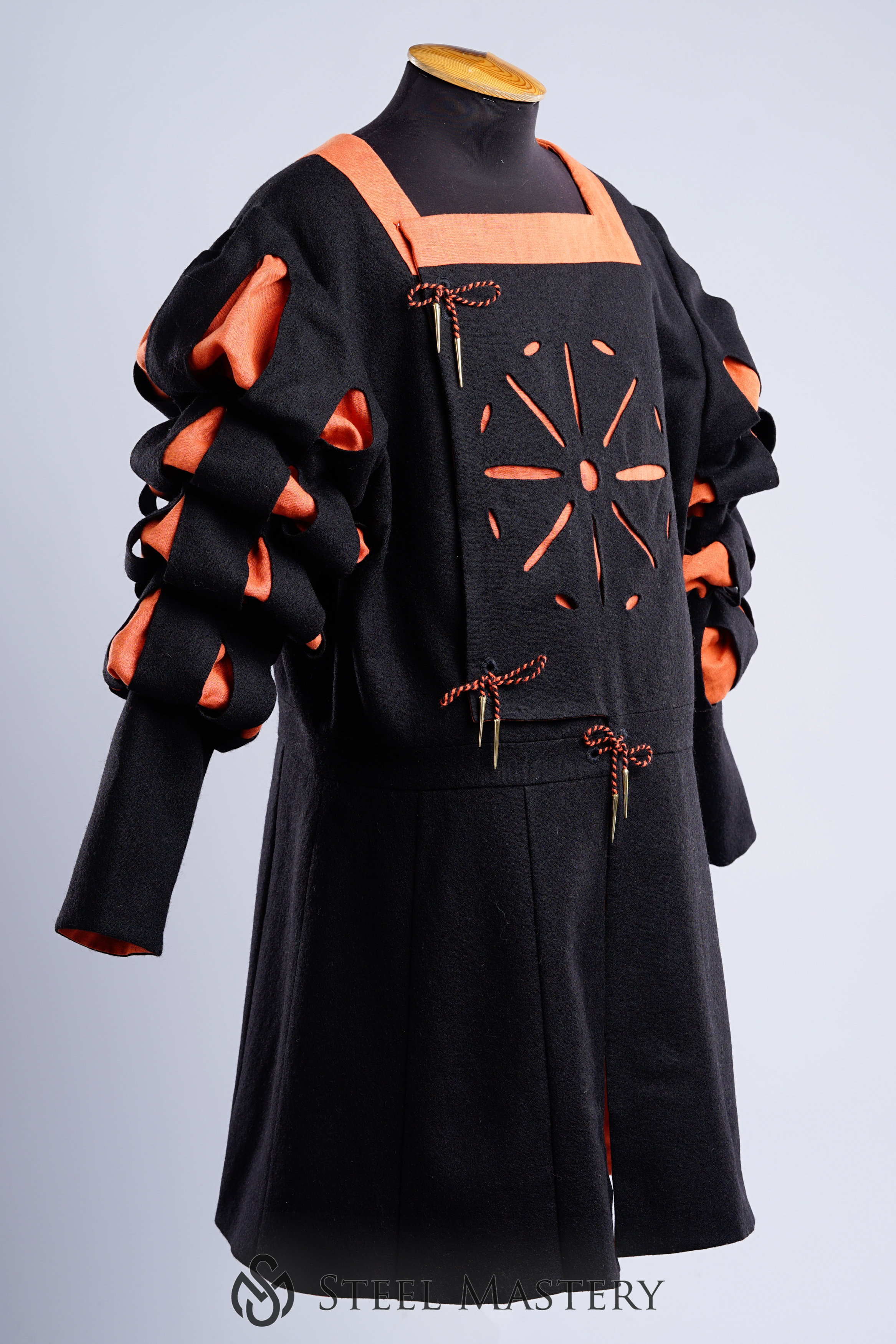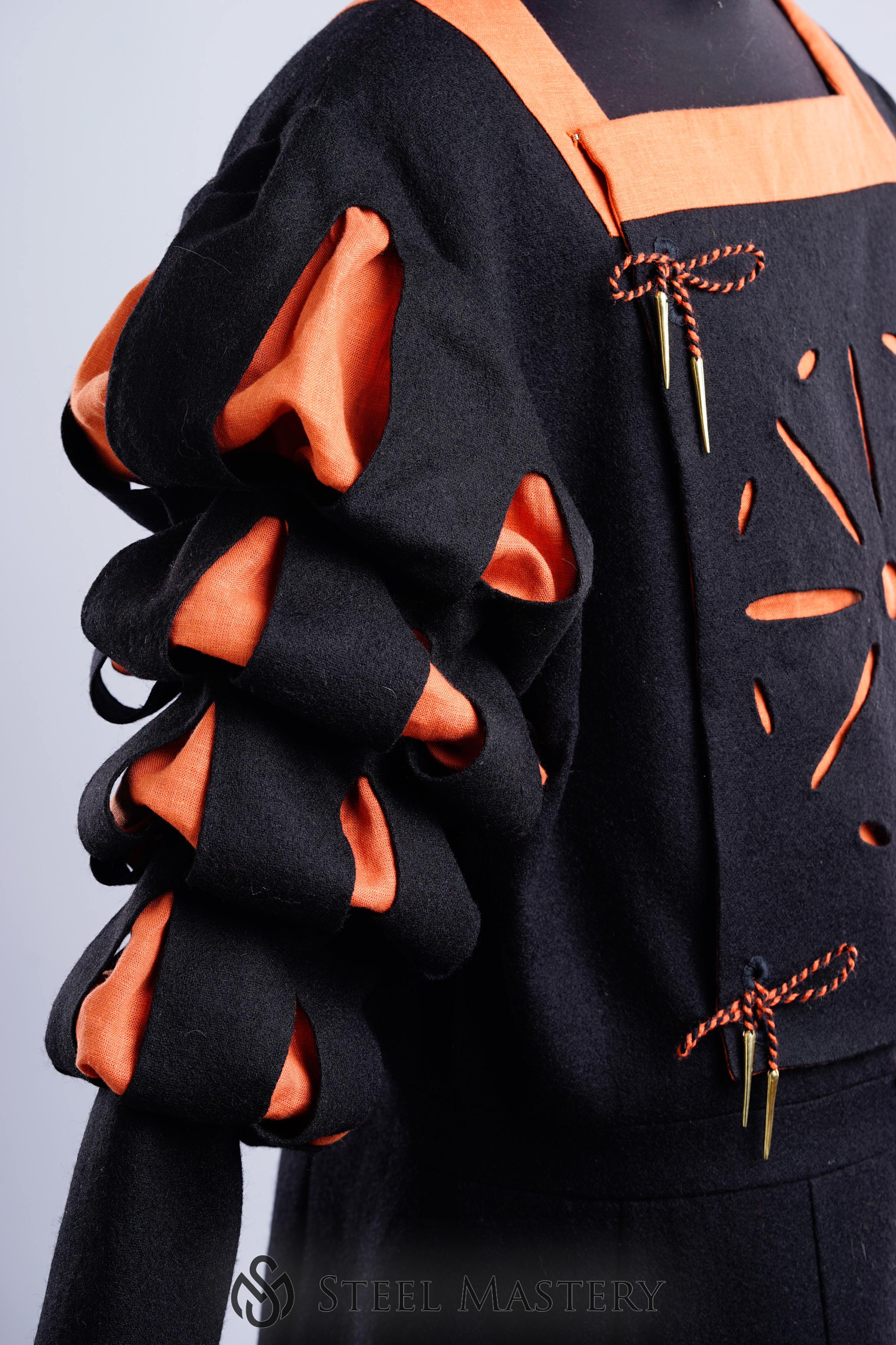 This particular coat features a striking combination of black wool and orange linen, with cuts on the chest, sleeves, and bottom edge. The black and orange color scheme of the coat is both eye-catching and symbolic. Black was a popular color for Landsknecht clothing, representing strength and authority. Orange, on the other hand, was often used as an accent color to represent wealth and status.