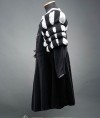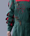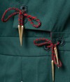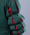 The coat is cut to fall just below the knee, with a loose, flowing silhouette combined top coat and skirt. The sleeves are wide with puffs and slits, with a slight taper at the wrist for a more fitted look. And the final touch of the coat is the hand braided rope with brass points.