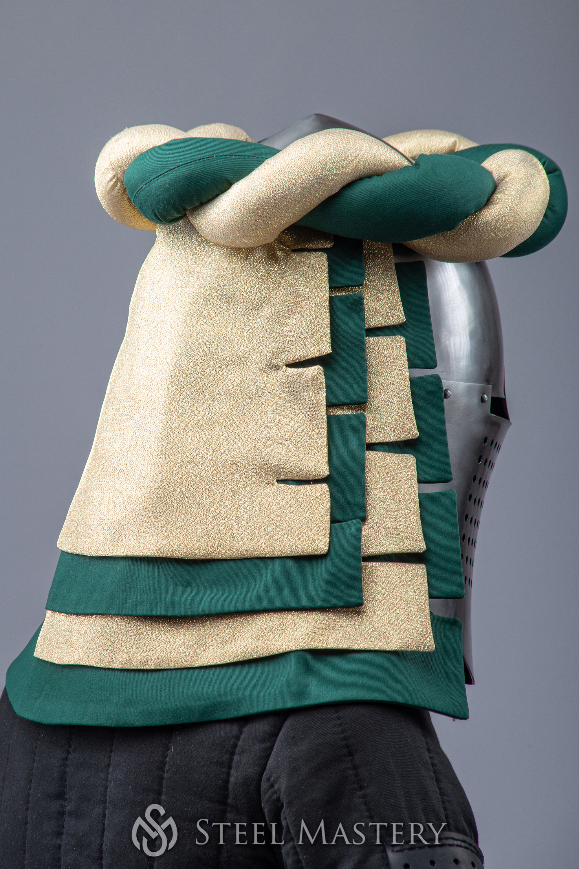 Elevate your medieval armor with our Gold and Green Medieval Torse (Bourrelet), an exquisite helmet wreath designed to add authenticity and elegance to your historical re-enactment or cosplay attire. Handcrafted with care, this torse is made from premium materials, ensuring both durability and a striking appearance. The gold and green colors reflect the traditional hues often associated with medieval heraldry, making it a perfect addition to your knightly ensemble.