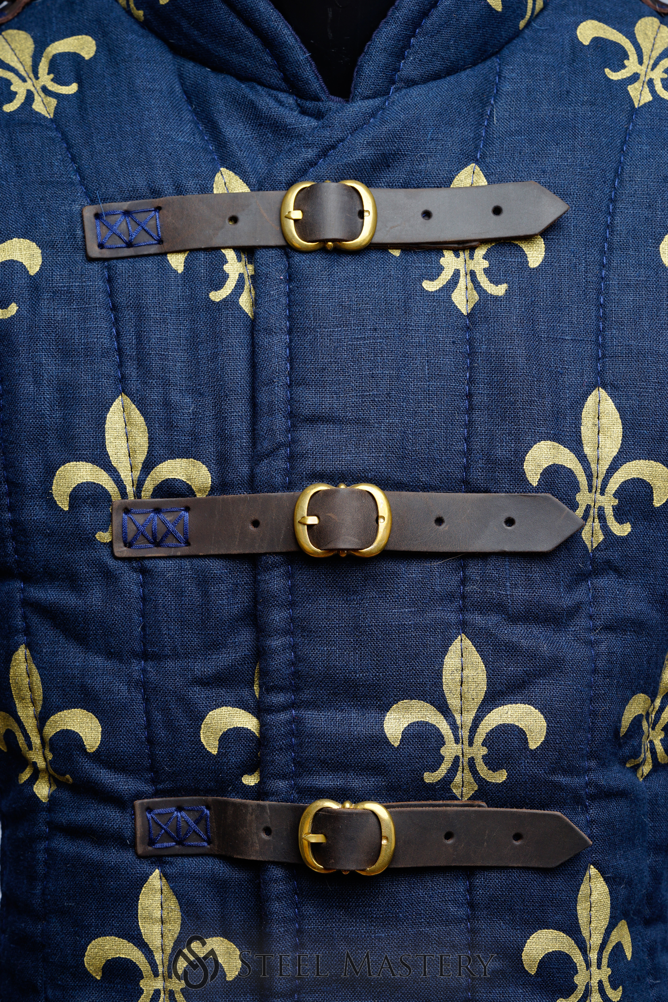 As it should, jacket sewn from natural fabric and has one layer of vatin padding in the basic configuration. It is quilted by checkered stitch on sides and down of back, and straight vertical stich at front, top of back and sleeves. Gambison fastens on the front with brass buttons decorated by emblems.