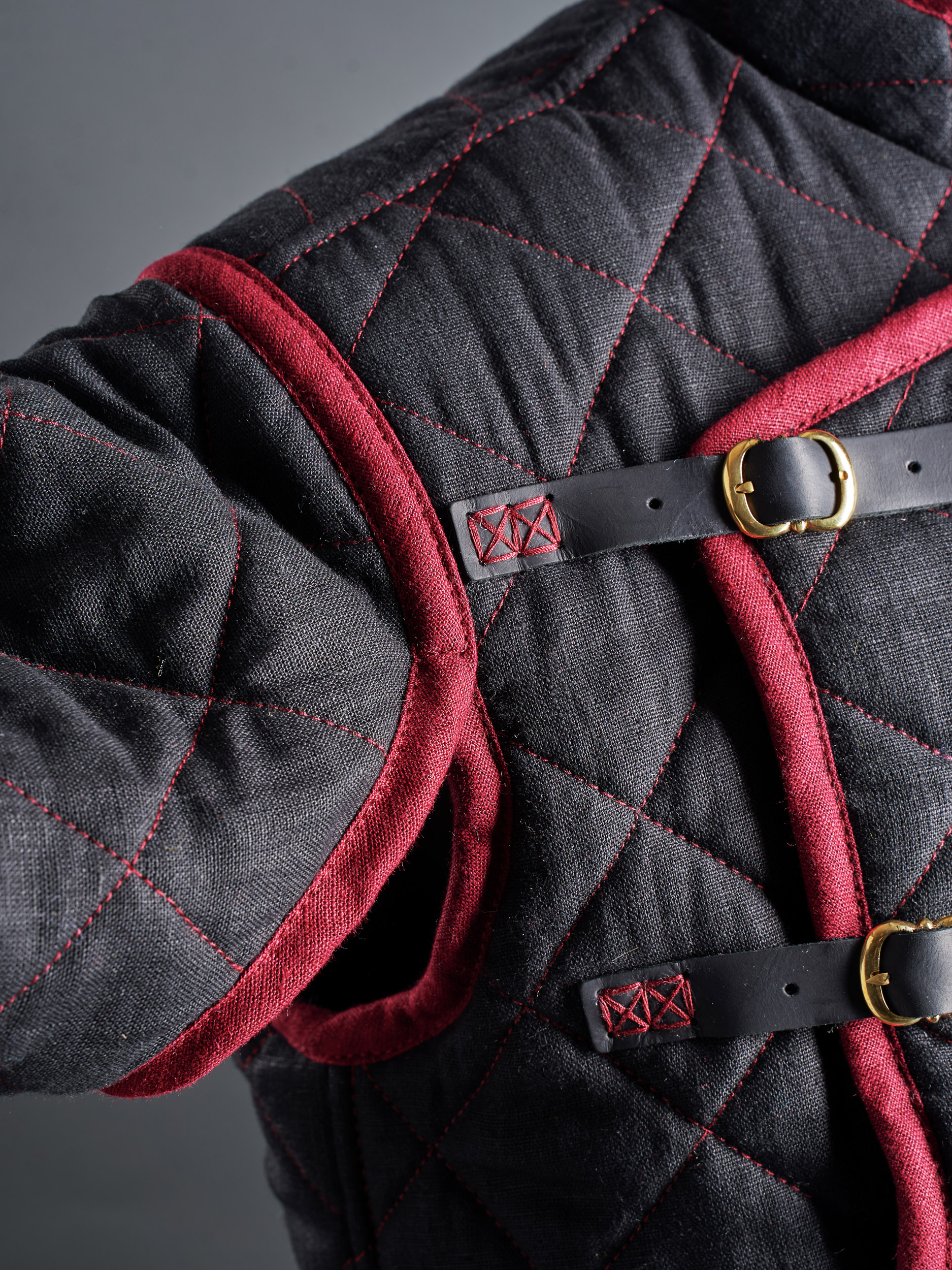 If you plan to use plate arms or spaulders over your gambeson, we recommend you to order leather fastenings for steel arms in black, red or brown leather.