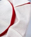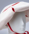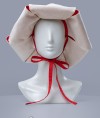 Headwear is made of wool with linen lining of contrast colour. It is tied up under the chin with fabric strap.