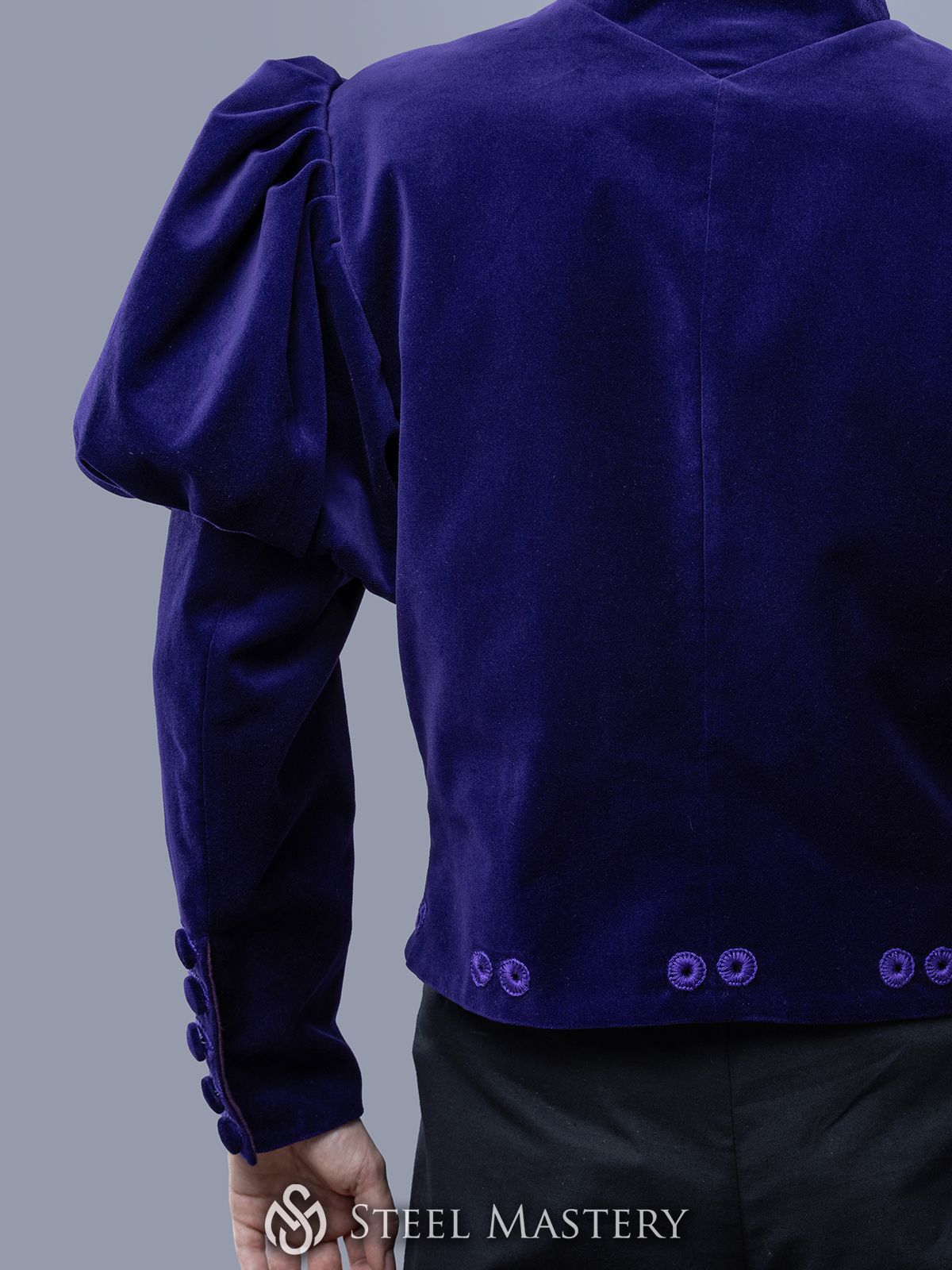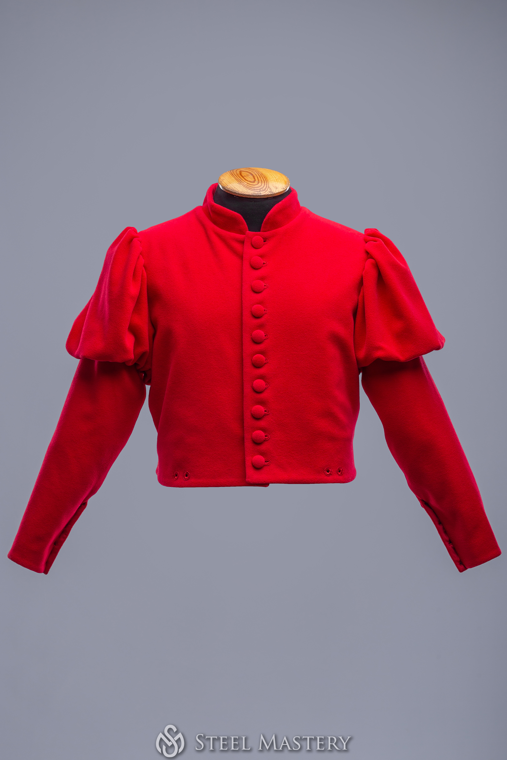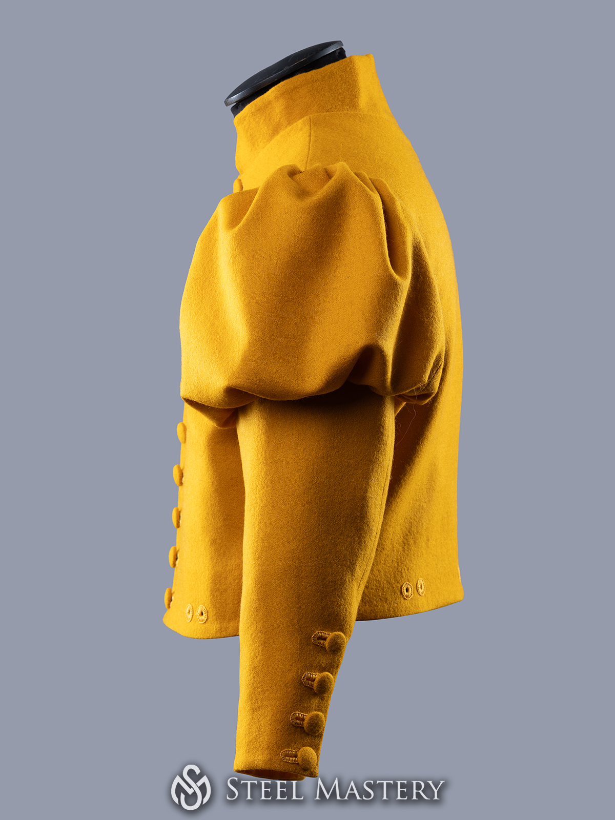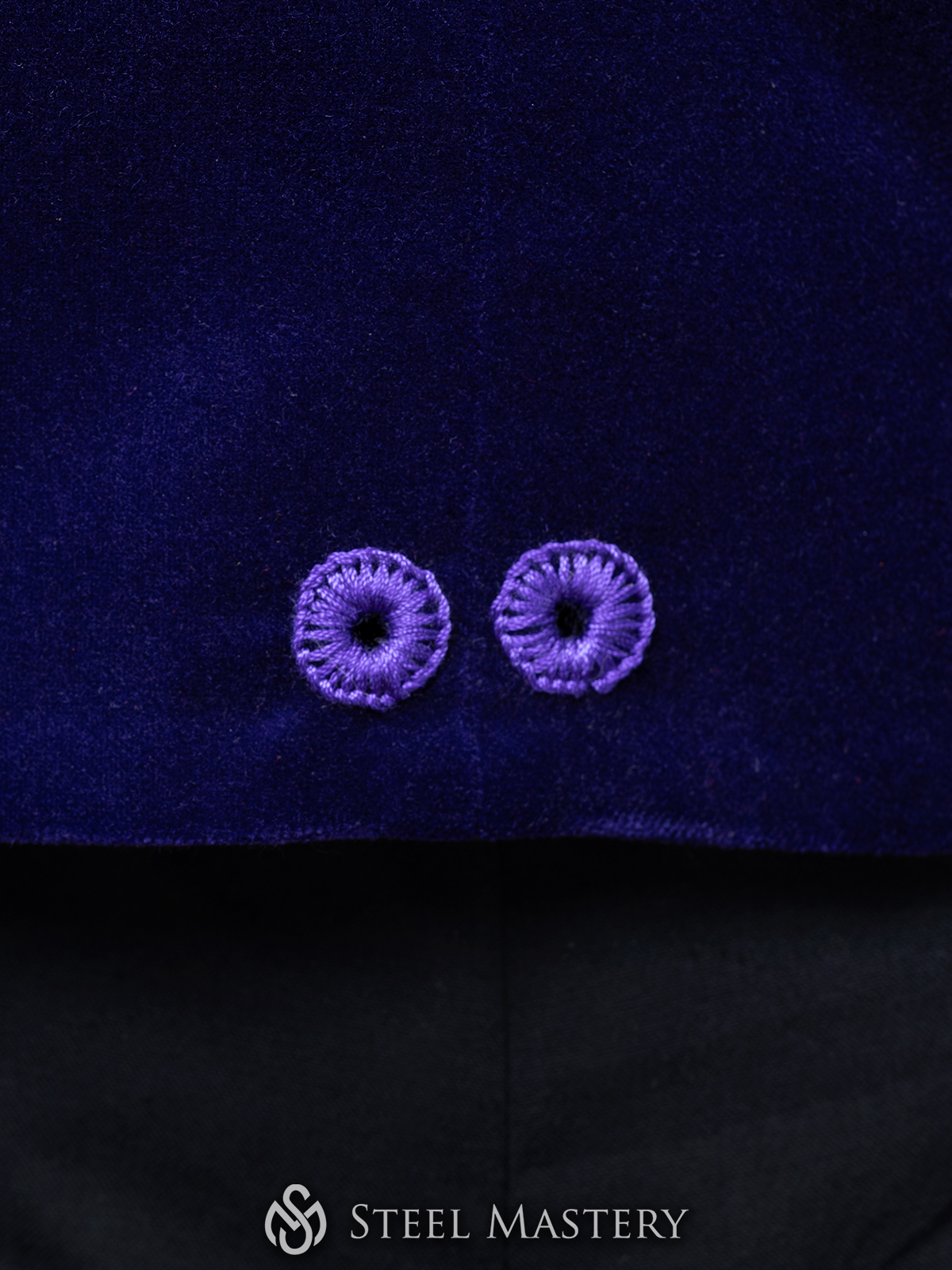 One of the defining features of the Burgundian doublet was the use of buttons, which were both functional and decorative. These buttons were typically made from materials like metal, bone, or wood, and were often covered with fabric to match the doublet. They ran down the front of the garment, allowing it to be securely fastened and providing a tailored fit.