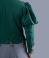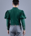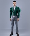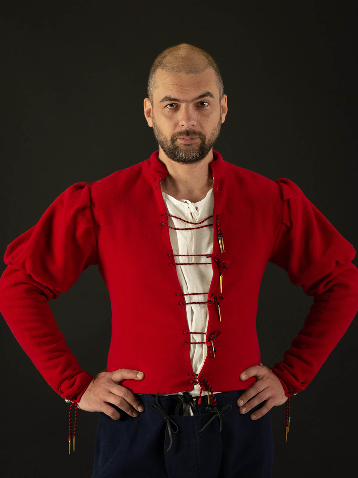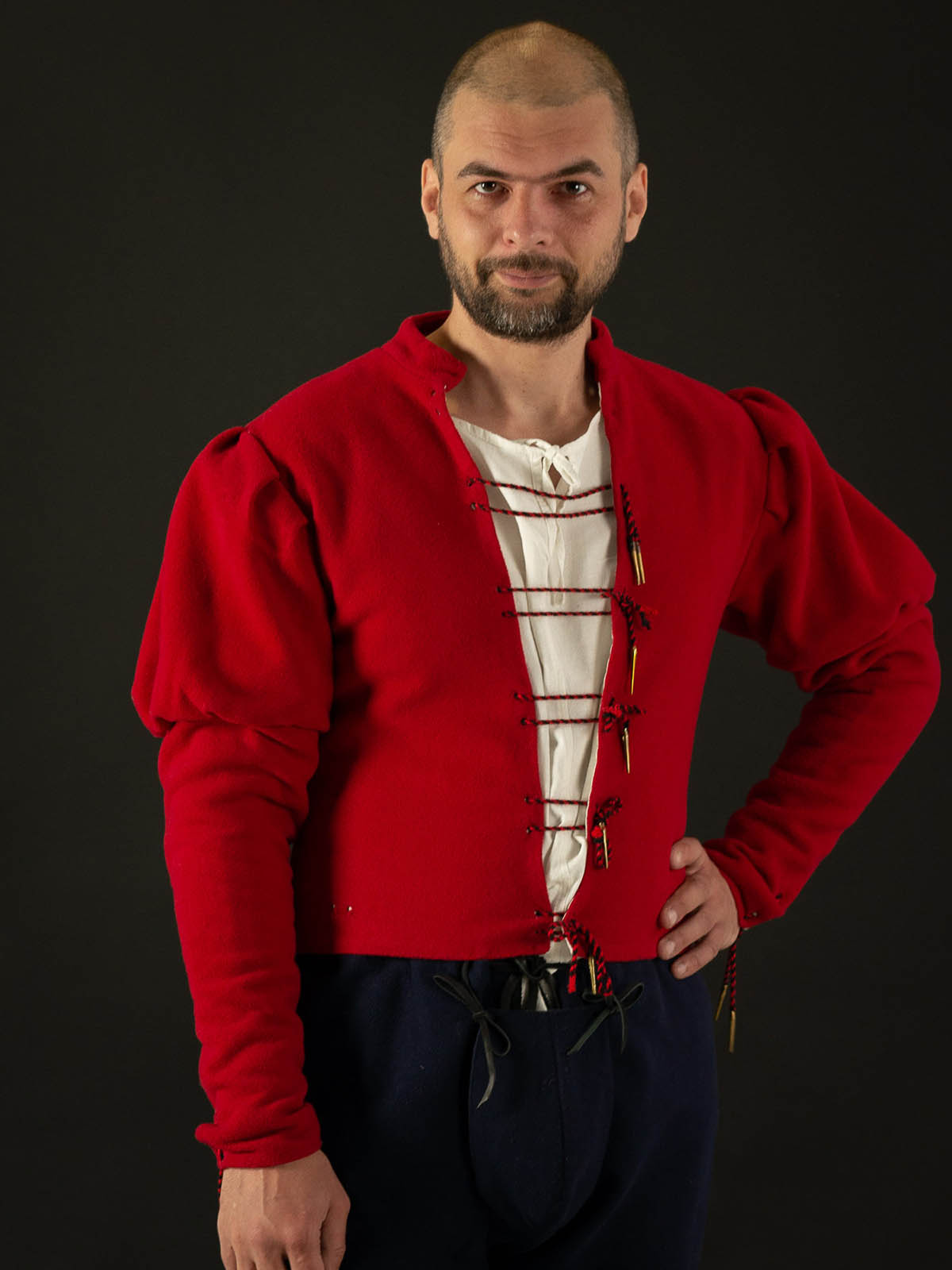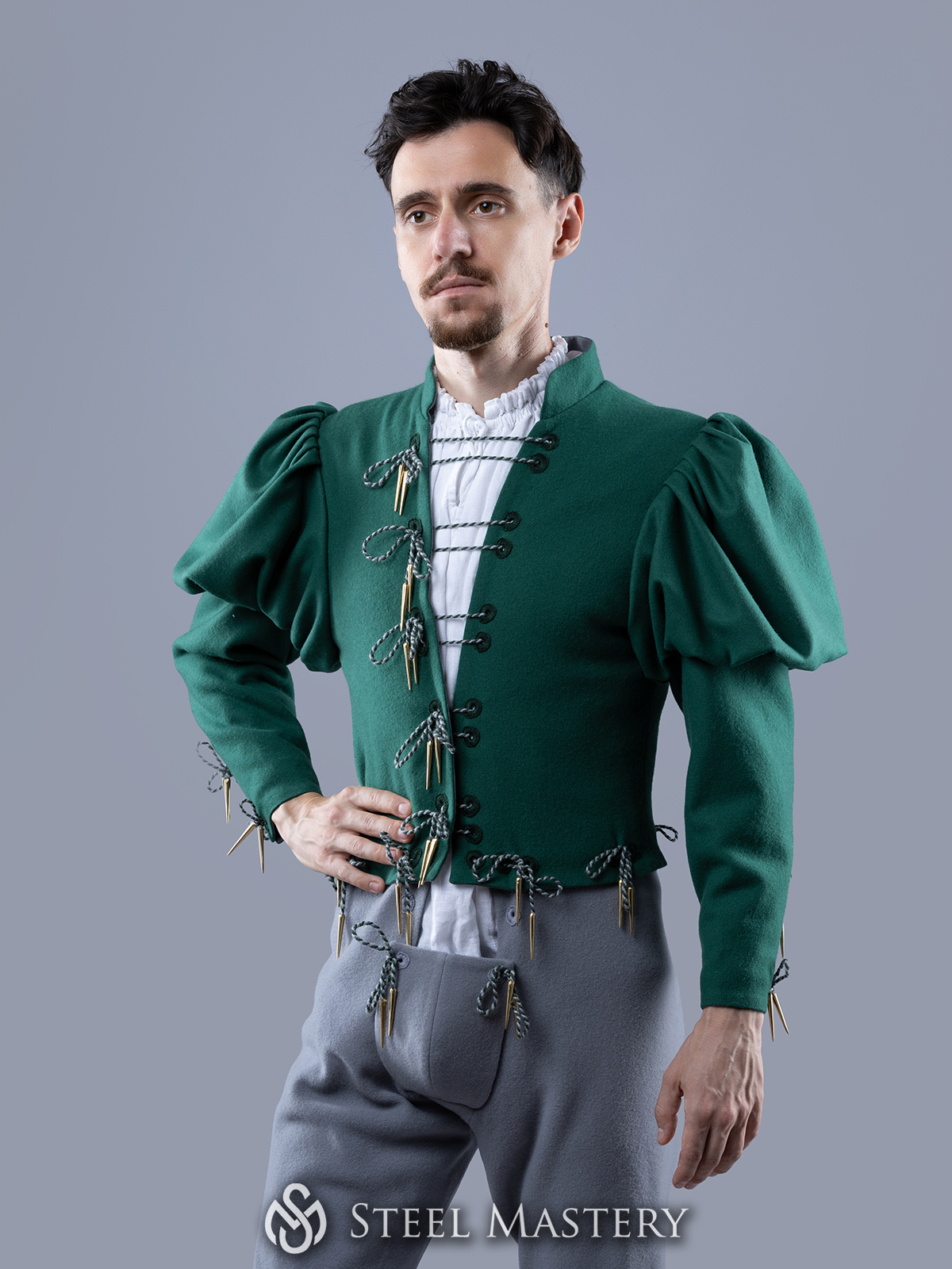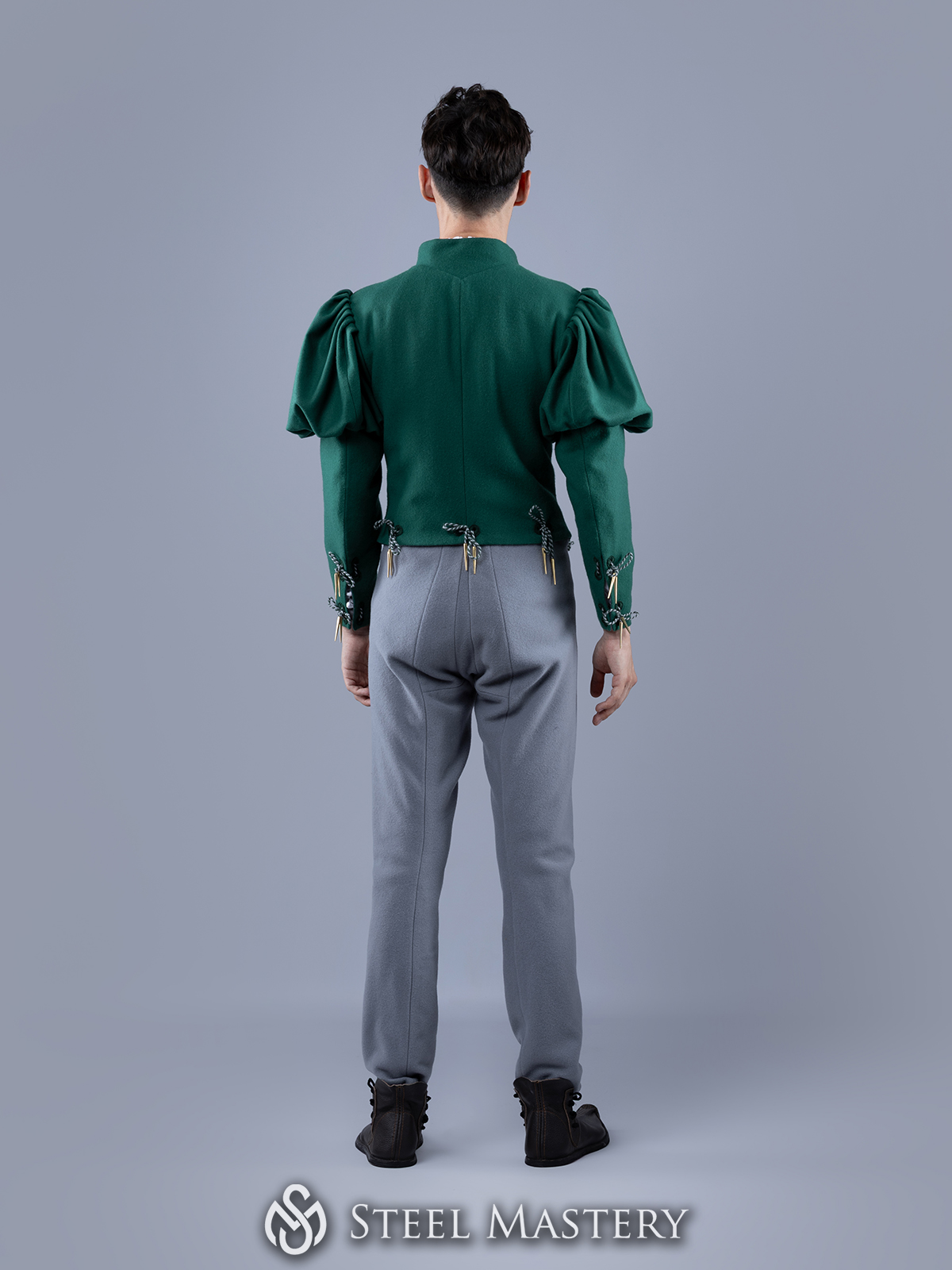 The doublet has a low stand collar, lush gigot sleeves with biceps buffs and lacing at the wrists. The hem, which emphasizes the waist, is equipped with laces to fasten the chausses.