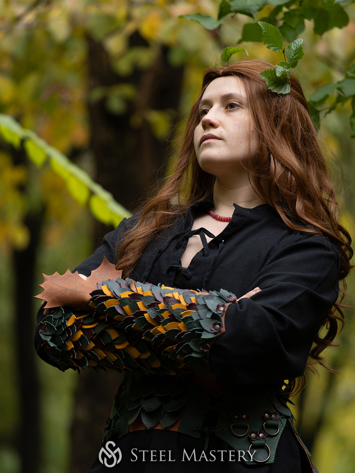 Fabriqué en cuir véritable de haute qualité, chaque pièce est teintée dans des tons terreux et façonnée pour évoquer les textures de la nature. Parfait pour le LARP, le cosplay, les séances photo fantastiques ou les performances scéniques.