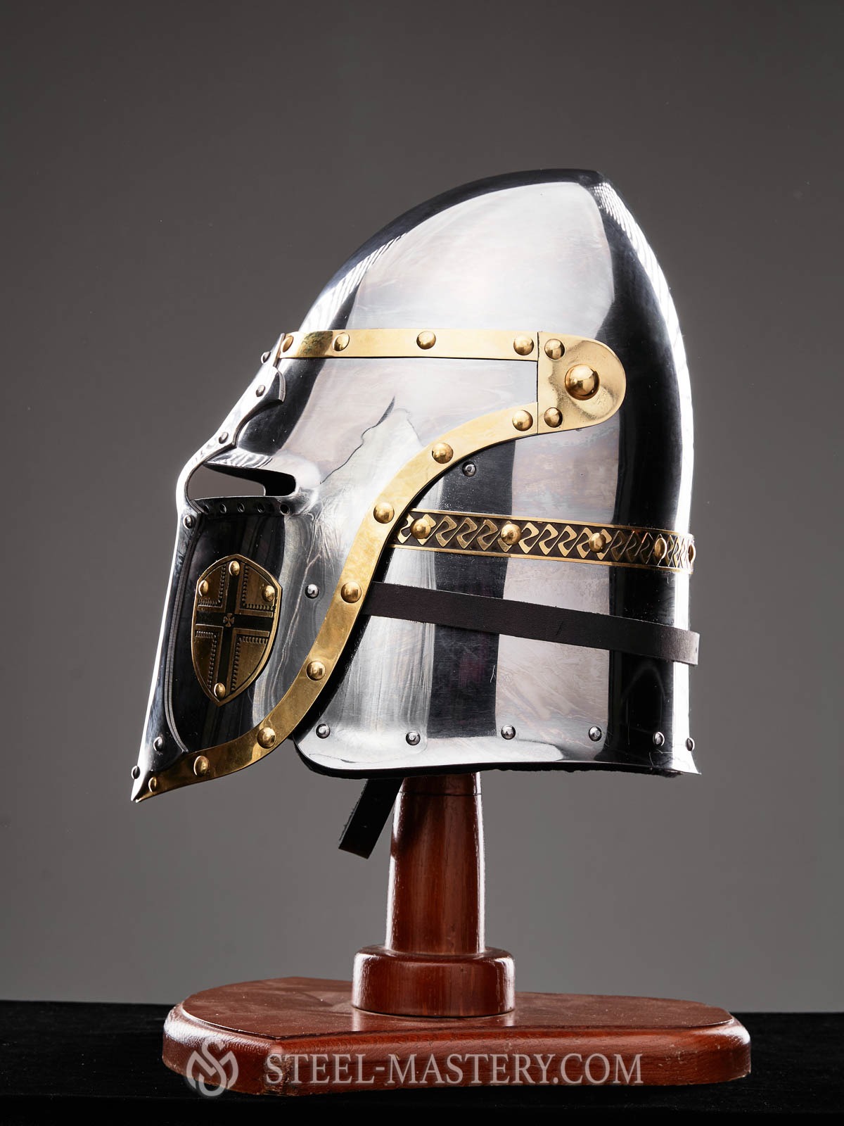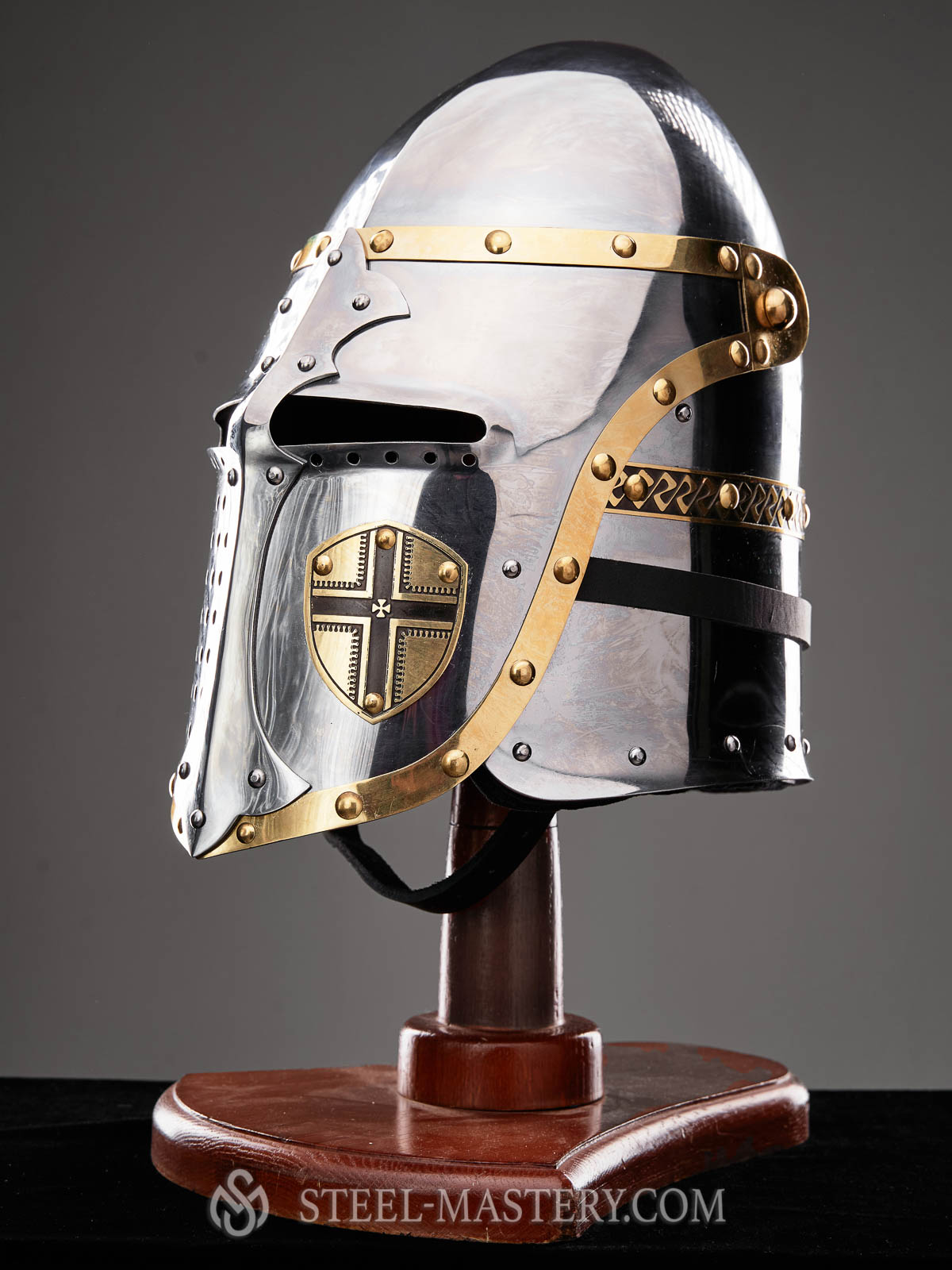 Helmet with mobile visor is a stylization of medieval helm, designed by our artisans specially for SCA fights.