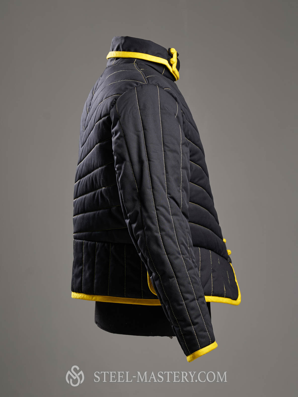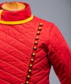This padded HEMA gambeson inspired by classic fencing camisole silhouette has high stand-up turn-down collar and traditional chest overlapping.