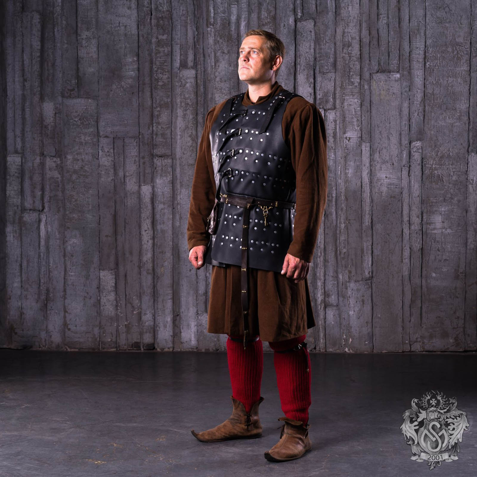 We recommend wearing of such medieval body armour over the padded gambeson. Brigandine arms and legs protection will be perfect addition.