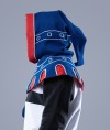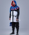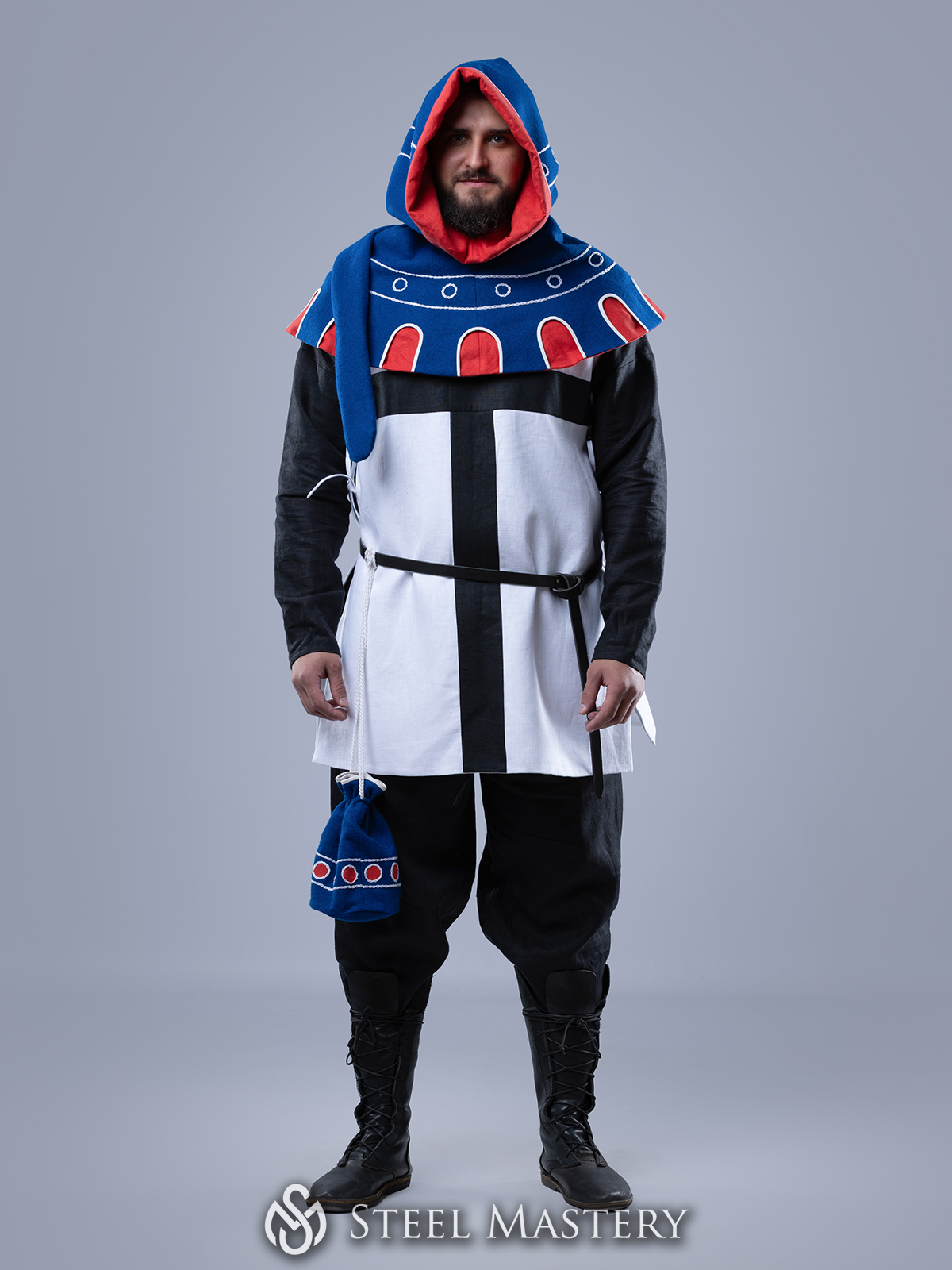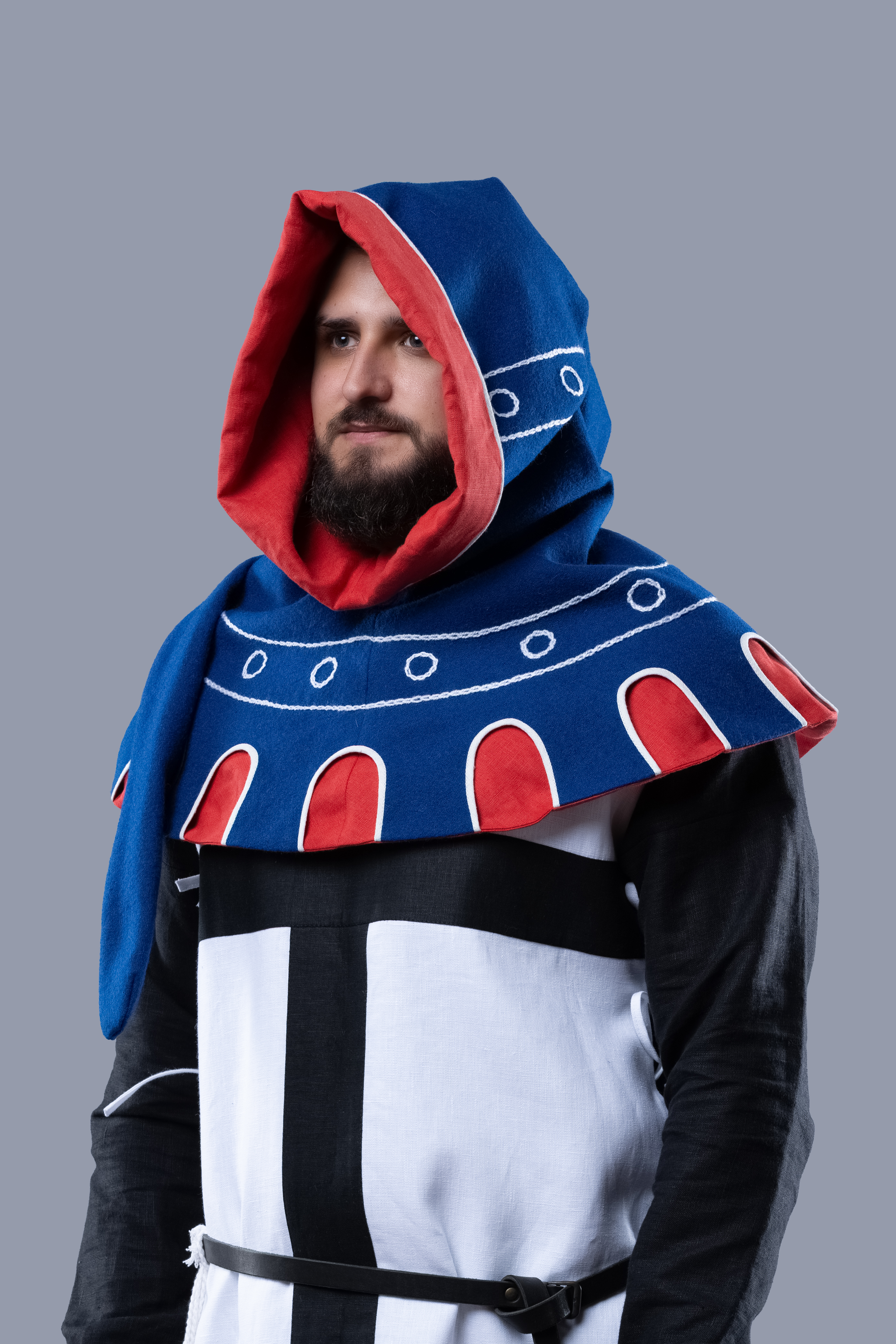 Son design comprend une capuche ajustée, une cape d’épaules intégrée pour une protection supplémentaire, ainsi qu’une liripipe prolongée — la queue caractéristique devenue emblématique de la mode médiévale tardive.