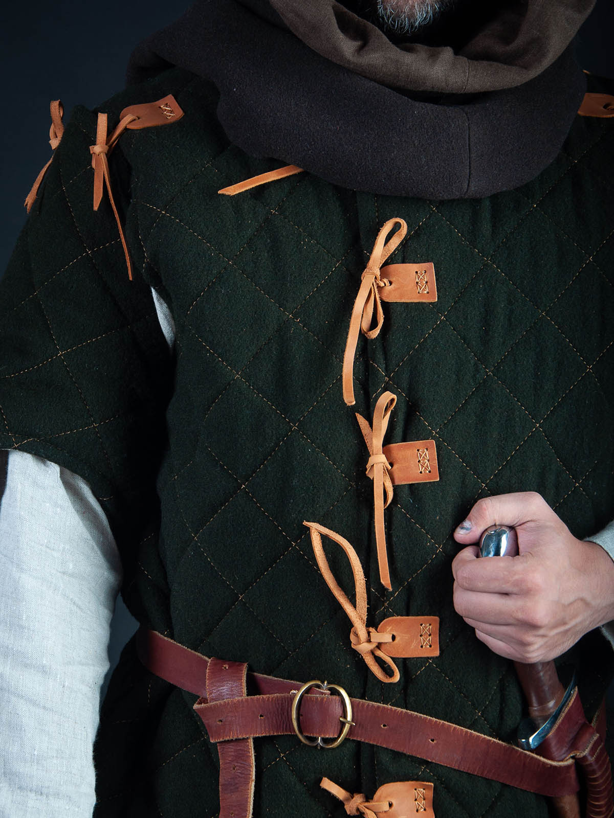 Just as medieval times, it got natural fabrics, wadding, stitching, and lacing for fastening. And now you can choose the way that your gambison will be sewn: machine manufacturing or hand sewing. As you guess, in first way tailors will make your padded armor using sewing machine, and second one is completely sewing by hands. Yes, stitch by stitch just as in medieval, for additional costs naturally.