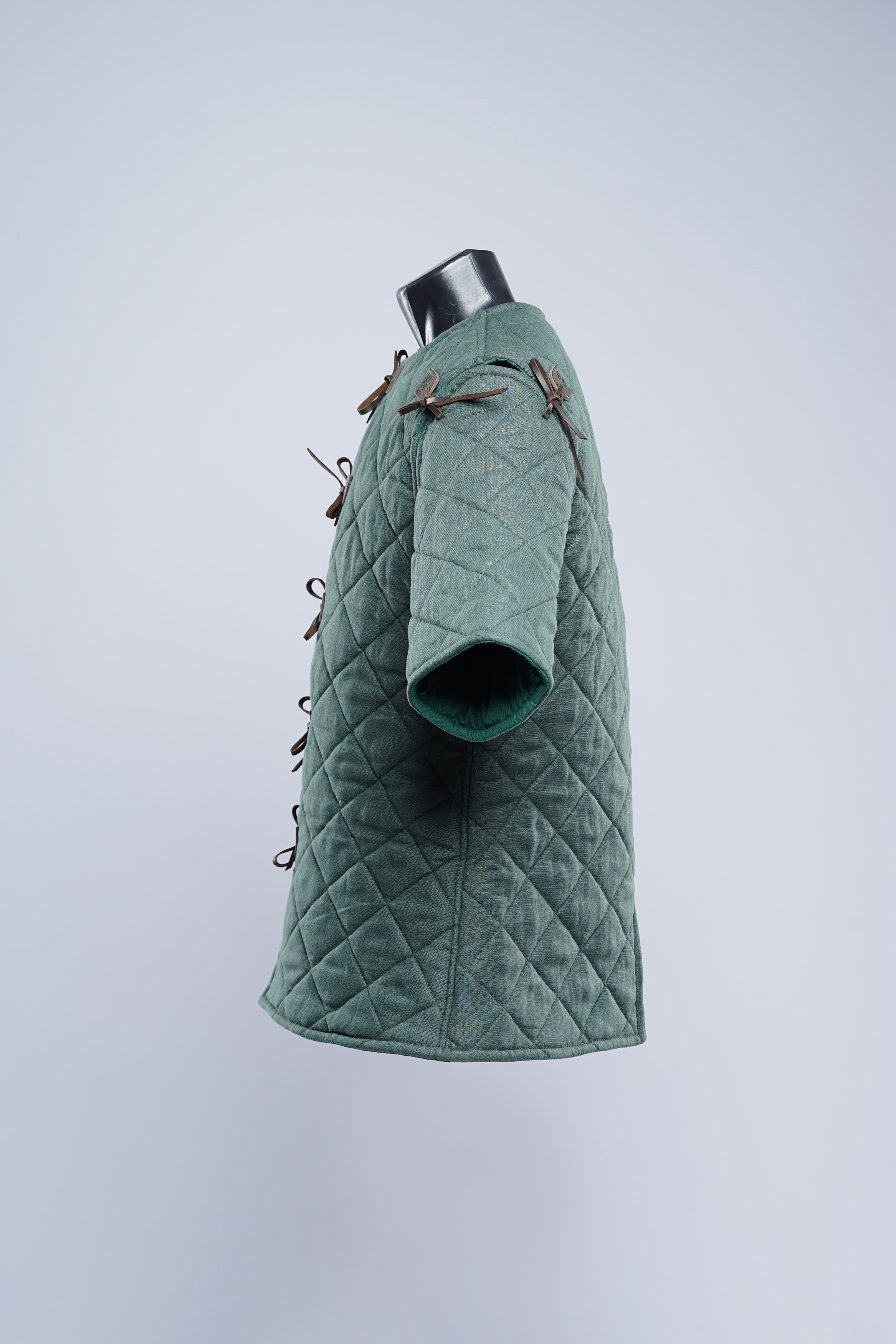 Almost weightless and freely tailored, he does not constrain your movements at all. It protects the shoulders and elbows, but does not interfere with pulling the bowstring. If Robin Hood were here, he would take this short sleeved gambeson.