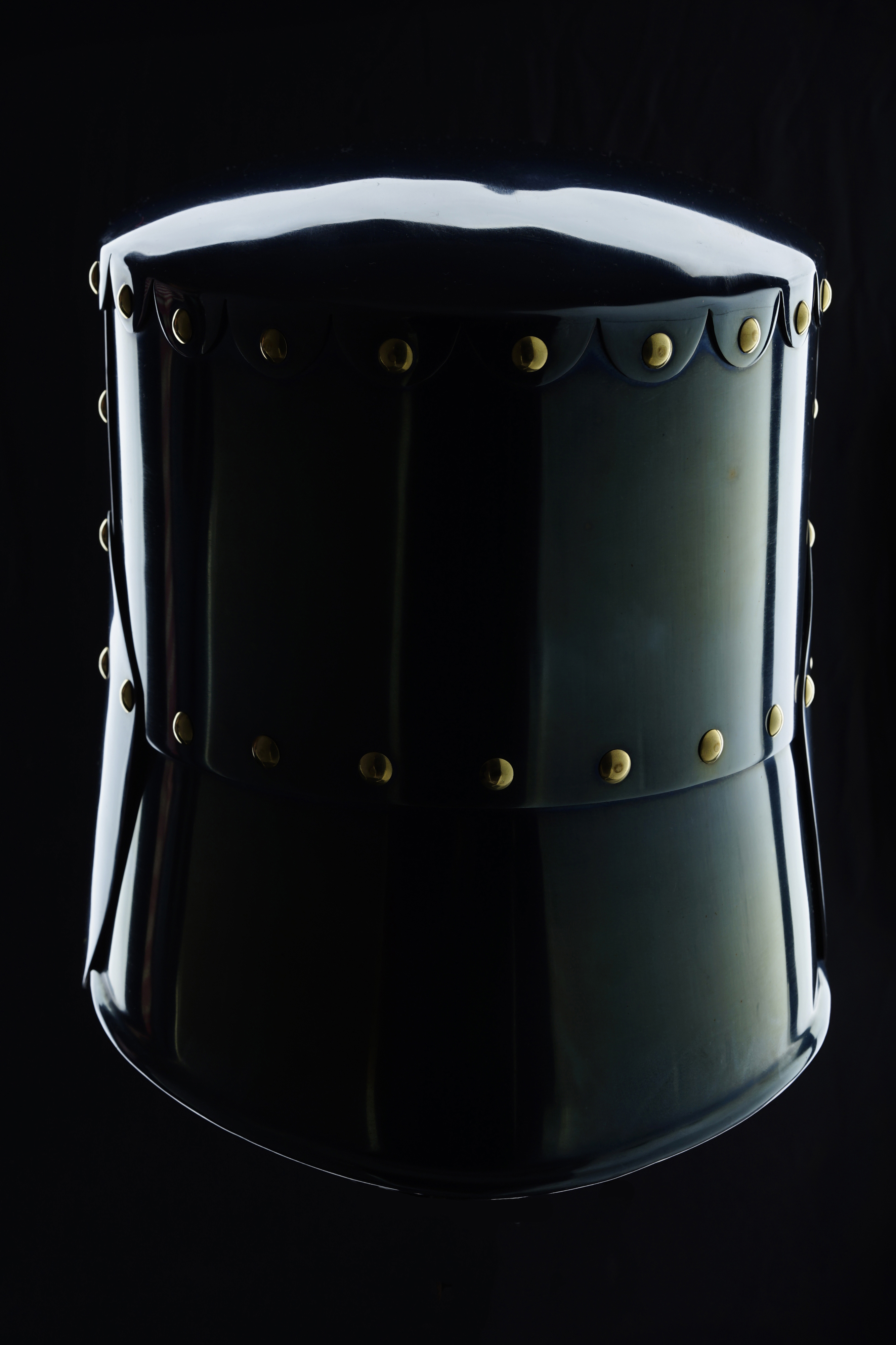 The shape of the helmet changed from conical to cylindrical. The former half-mask was solved drastically - in the cylinder there were simply holes for the eyes and a lot of small holes below for ventilation. And on the top of it they just riveted a metal circle. That is how we got the pothelm, affectionately known amongst re-enactors as the bucket.