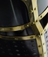 Frontage of pot helm is equipped with forced cross-shaped plate. We recommend wearing of this medieval battle helm over mail coif and padded liner for complete protection.