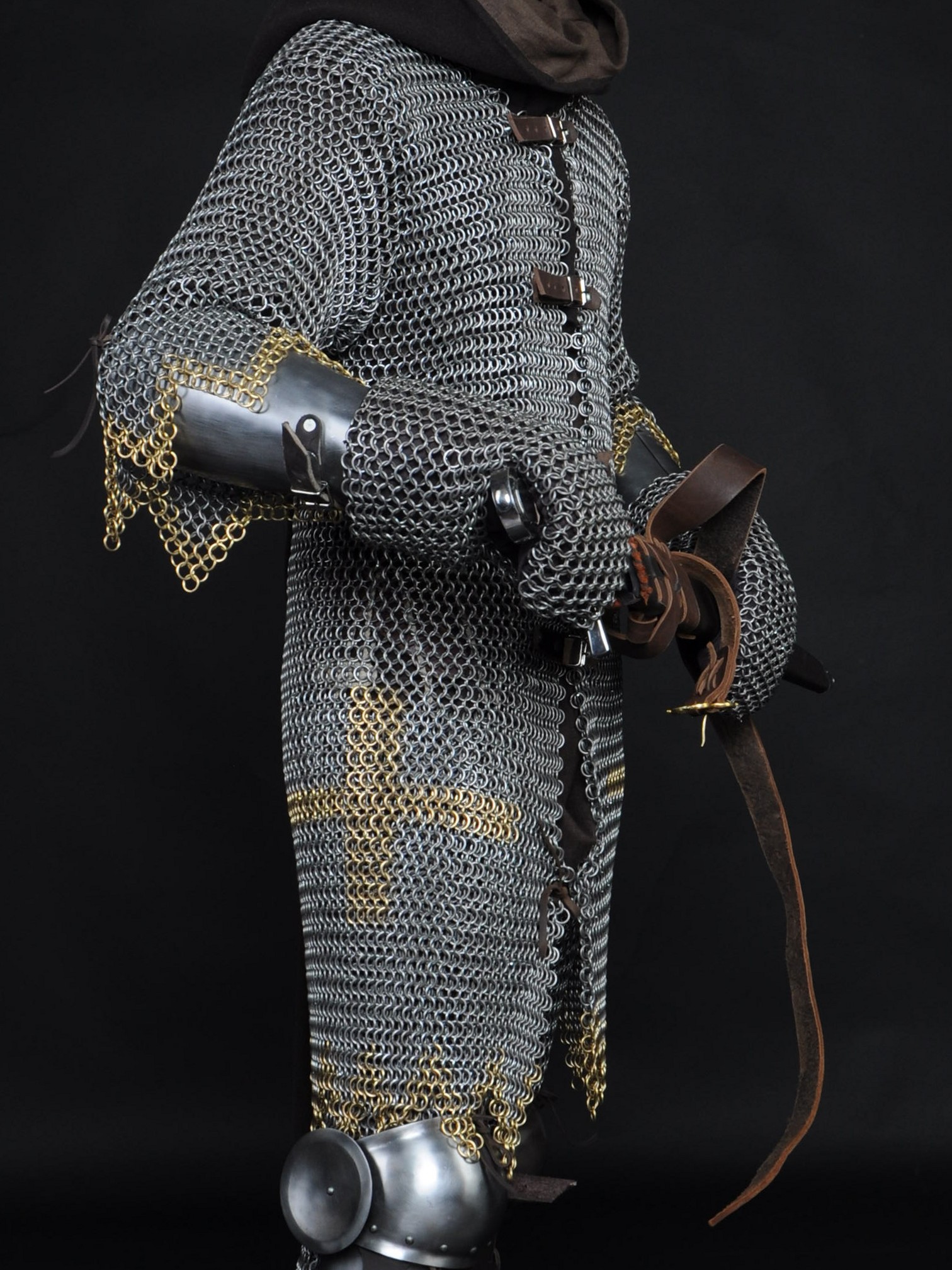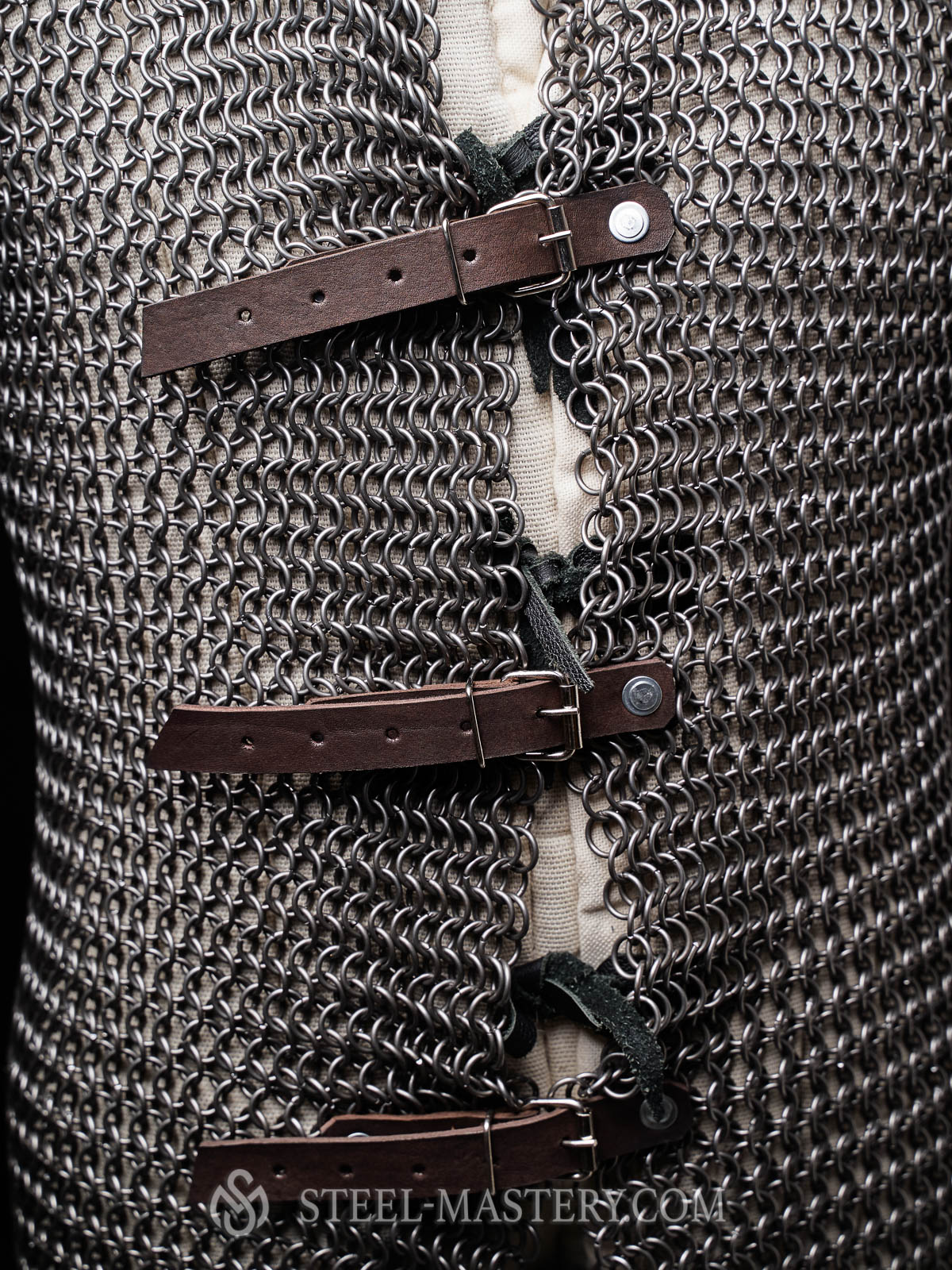 There are leather belts with steel buckles from the front of hauberk for fastening.