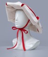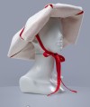 Headwear is made of wool with linen lining of contrast colour. It is tied up under the chin with fabric strap.