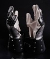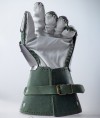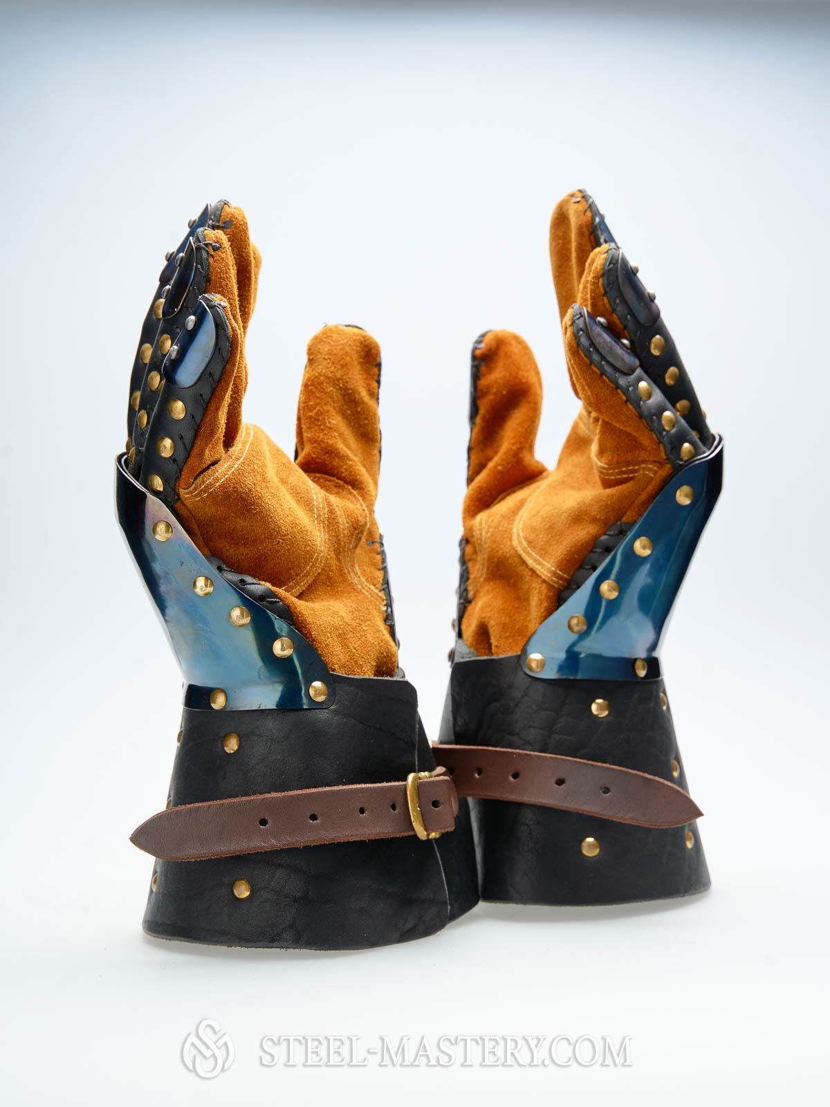 Metal plates are installed from the inner side of leather wristband, which is completely covers the wrist. Fingers are protected by overlapped steel plates. Leather straps on the palm part and belts with buckles on the wrists safely keep this medieval knight armour on the hand.
