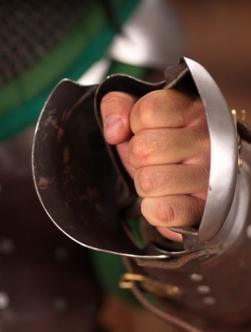 Knight on the main photo is equipped also with helmet bascinet with visor “Wolf ribs”, steel shield buckler and plate greaves. You may order these items separately at our medieval armor shop. We recommend using of brigandine protection only over padded chausses and gambeson.