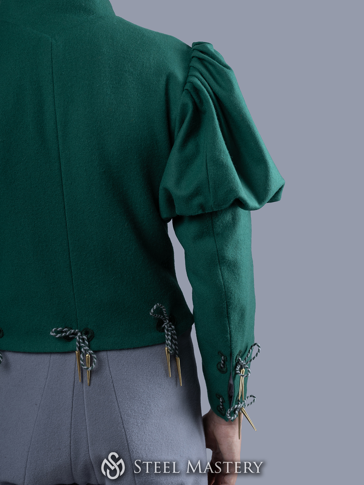 Let's start with the Burgundian doublet, XVth century. This is an indispensable element of the costume of any self-respecting Burgundian man in the XVth century. Tight fit over the body, lush bouffant sleeves, sexy chest slit and stylish lacing on the chest and wrists. A small stand-up collar and laces for tying up the chausses to the doublets' hem. Everything about it is laconic and stylish.