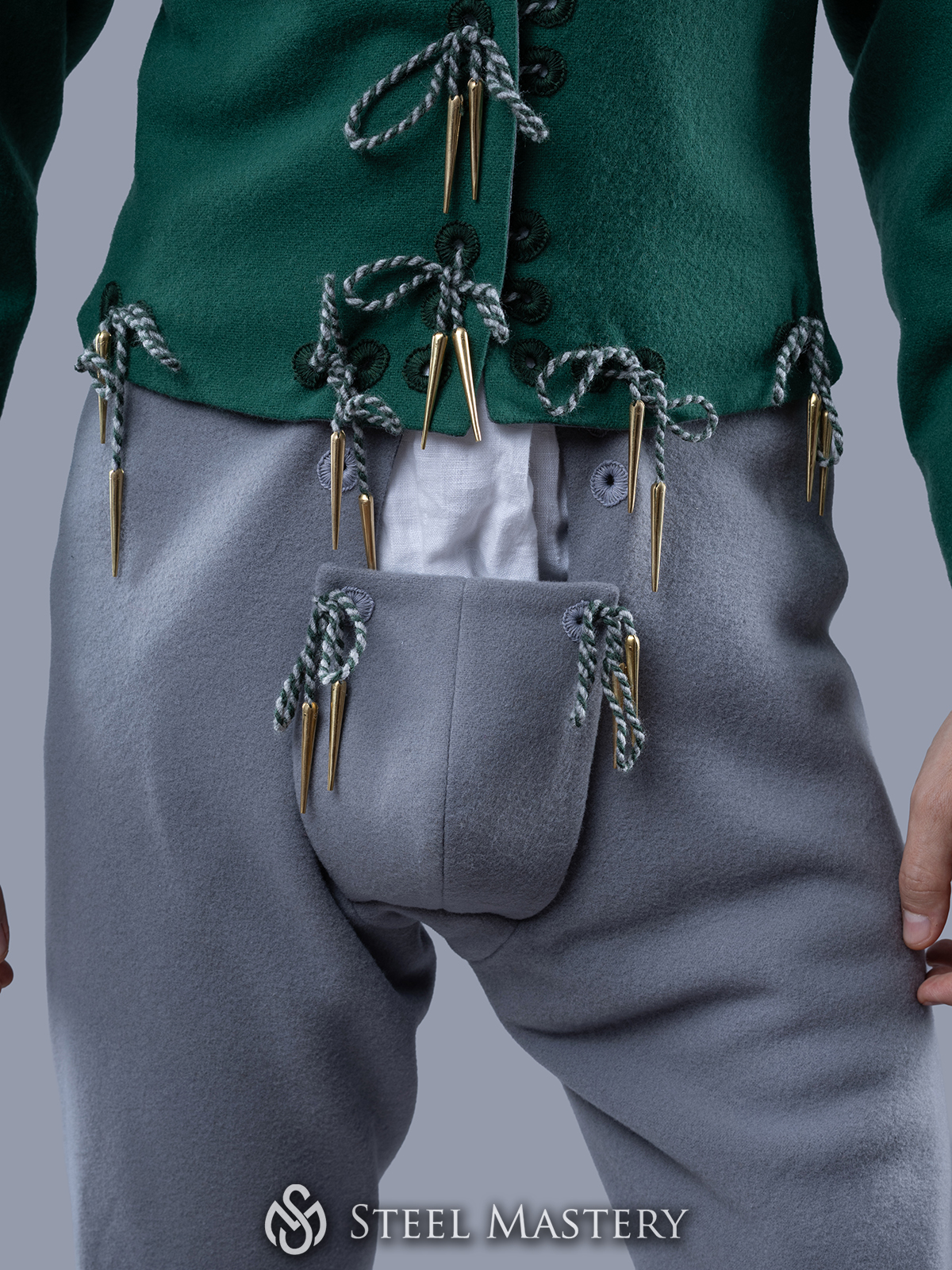 On the feet of our dandy you may see tight chausses with codpiece, XV century, which recently became fashionable in Europe. They are sewn on the back and the codpiece, folded down, is attached to the waist with 3 laces. It's a very comfortable and at the same time quite historical model of chausses, which you will undoubtedly appreciate.