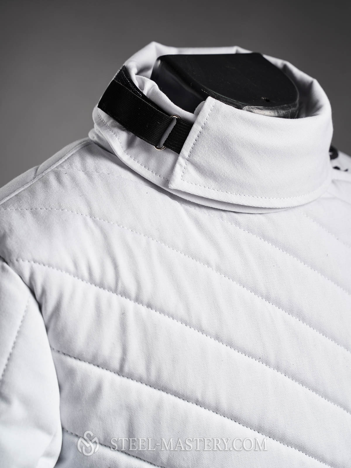 Modern high-leveled padded HEMA torse protection with the silhouette of classic fencing camisoles. Today's gambeson is equipped with a high stand-up turn-down collar and functional cut with chest overlapping.