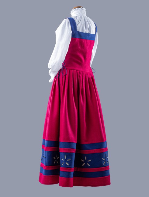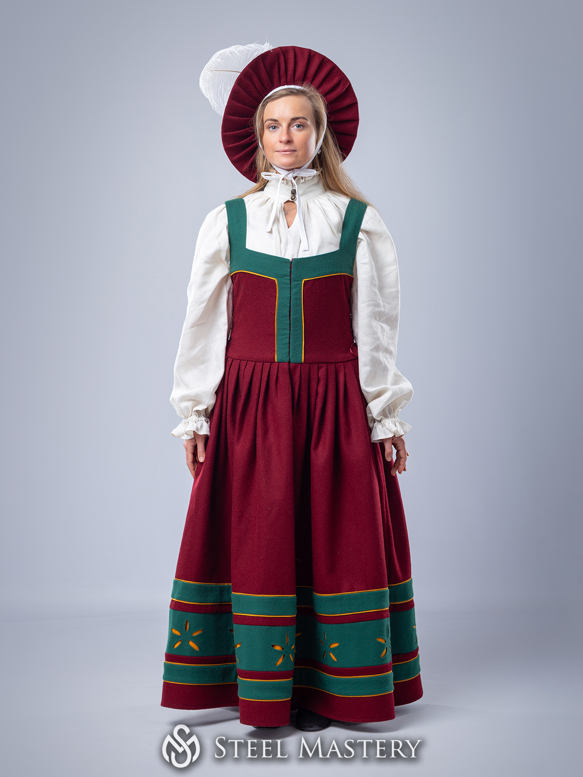 È composto da una maglia intima bianca con collo alto e maniche lunghe e da un abito esterno in lana con motivi floreali. L'abito si distingue per il suo design luminoso e audace, che riflette lo spirito dei mercenari medievali. Gli inserti neri e i motivi floreali ne aumentano l'eleganza e l'unicità. Il collo alto e le maniche lunghe conferiscono alla blusa un aspetto classico.