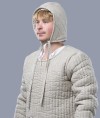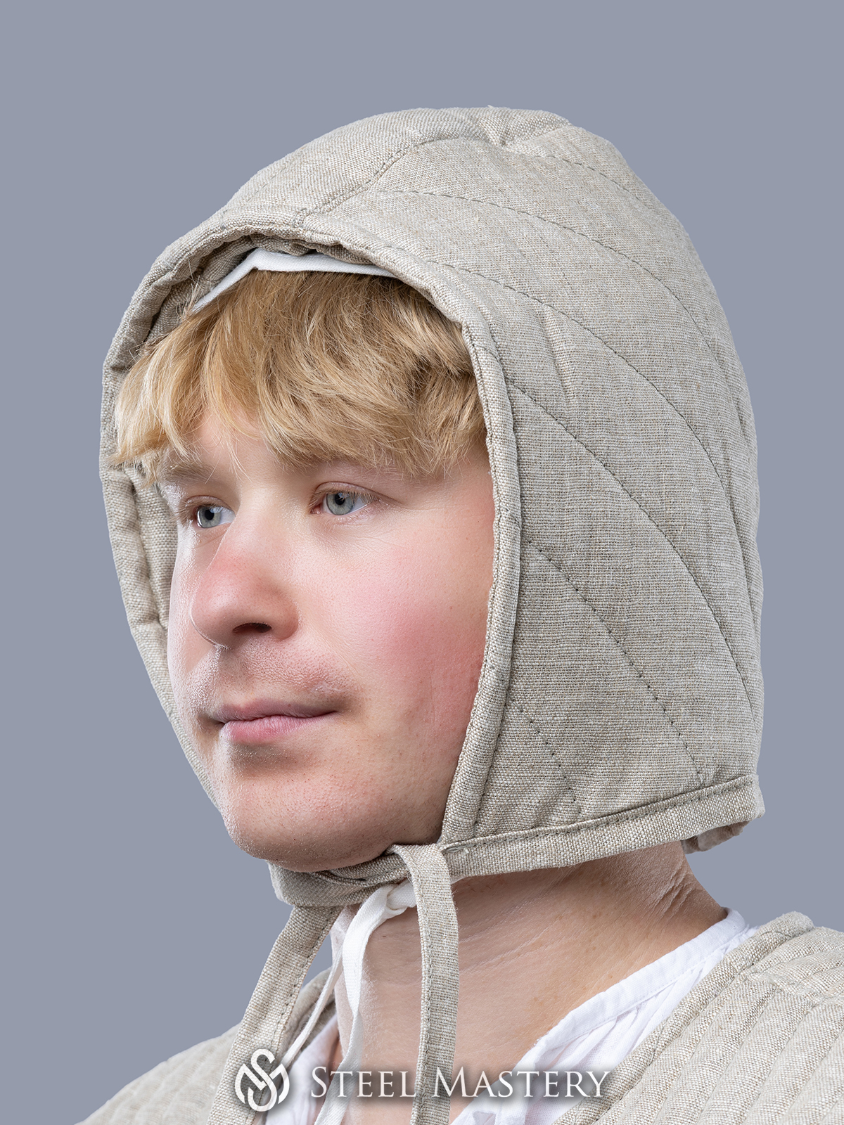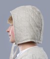 Una cuffia medievale aderente con una silhouette strutturata e linee di trapuntatura curve distintive.