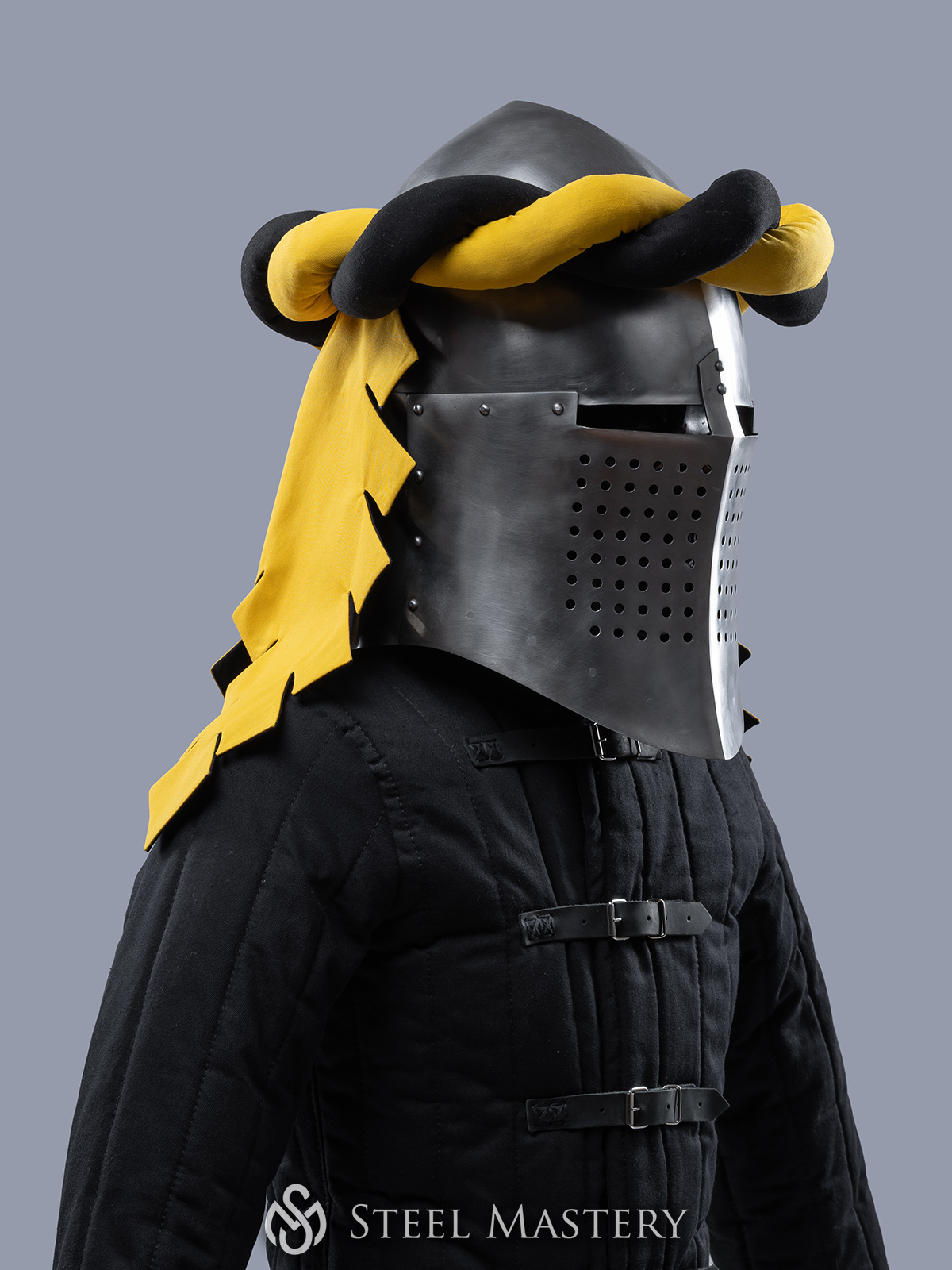 Un copricapo medievale distintivo caratterizzato da un torse attorcigliato e un lungo mantello con coda affusolata. La forma scultorea e la silhouette dinamica riflettono le tradizioni araldiche e visive del tardo Medioevo, rendendolo un elemento di grande impatto per abiti storici.