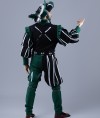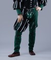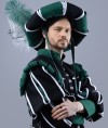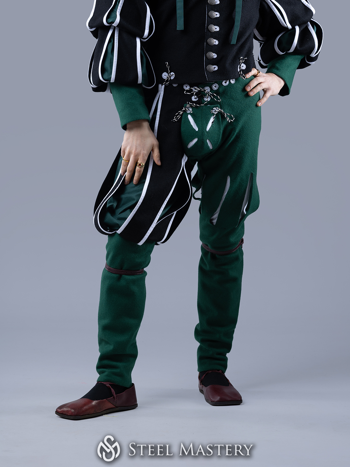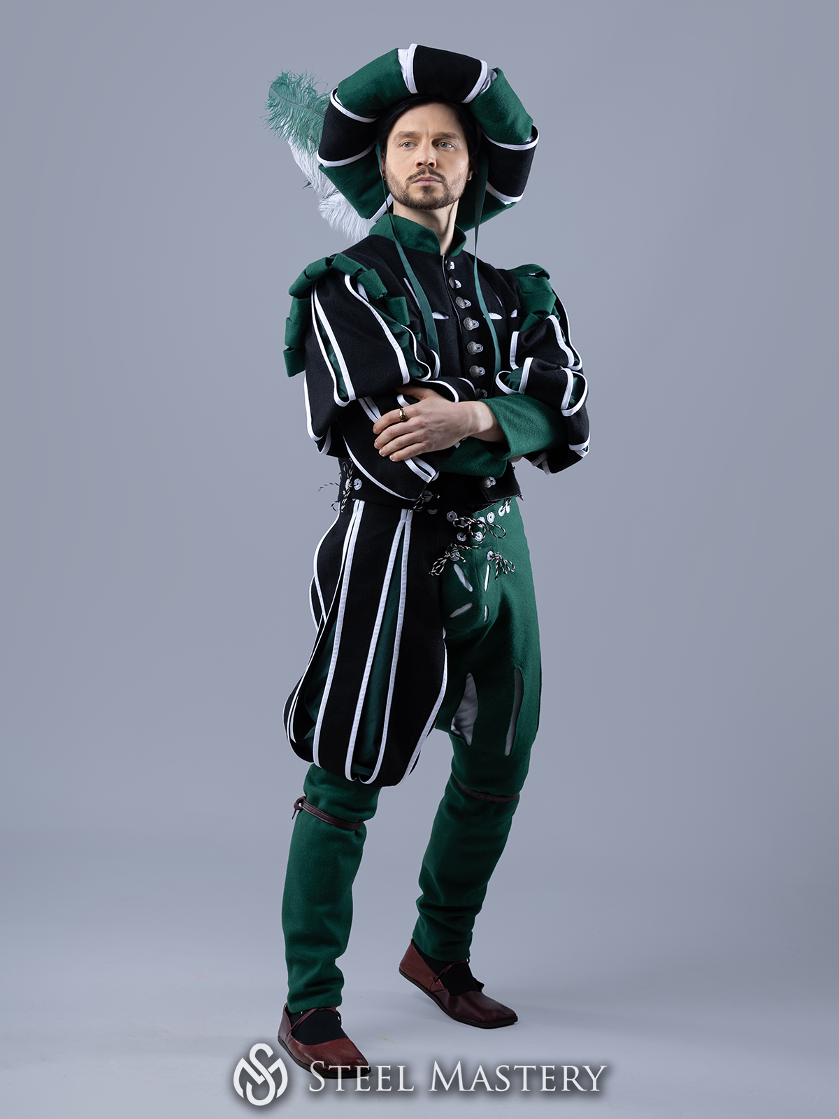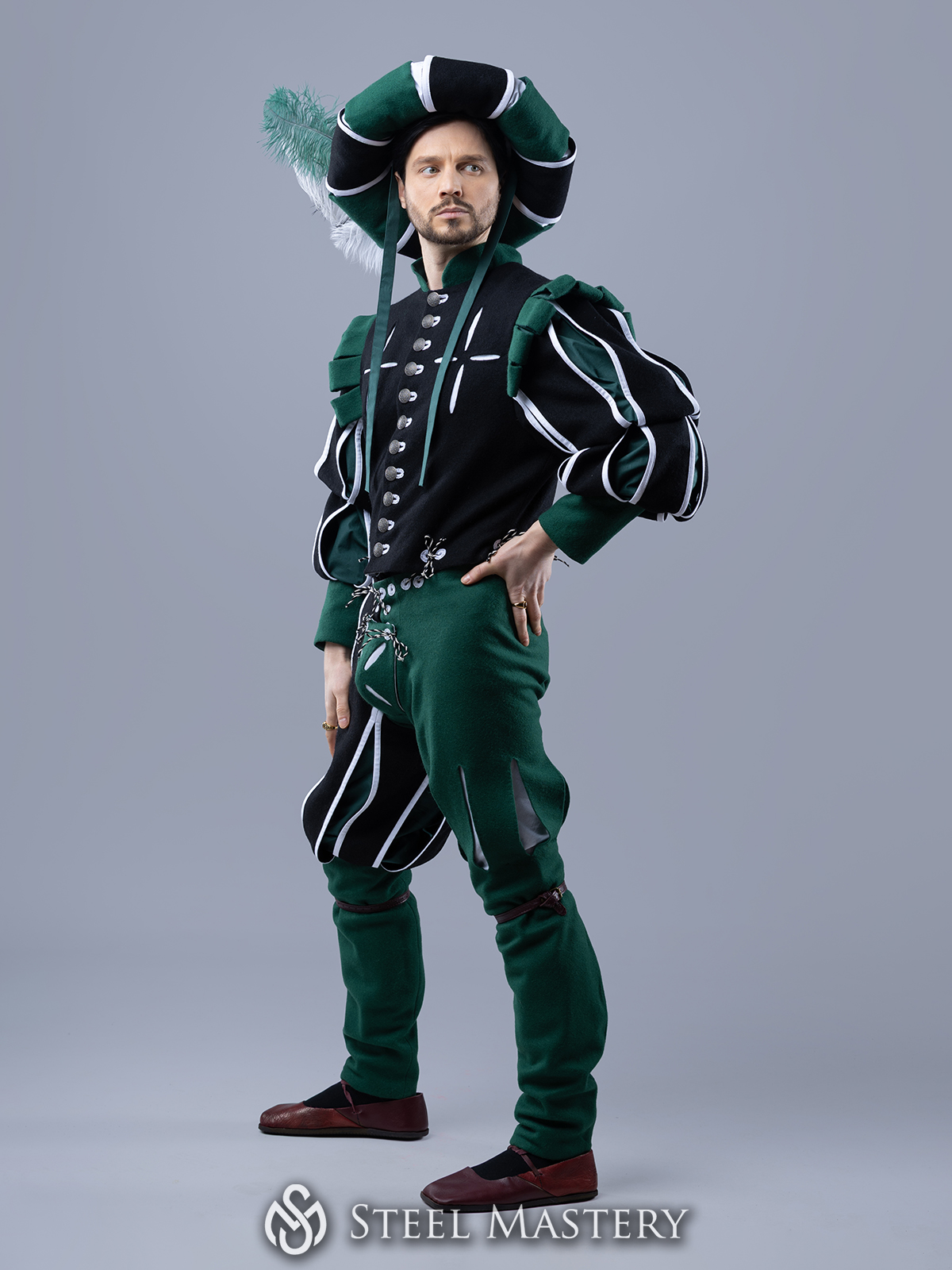 Il farsetto è confezionato per creare una silhouette rinascimentale strutturata, tipica della moda lanzicheneccha del XVI secolo. Le calze aggiungono volume e contrasto propri dell’abbigliamento nobiliare dell’epoca, mentre il cappello coordinato completa l’insieme e ne rafforza il carattere storico.